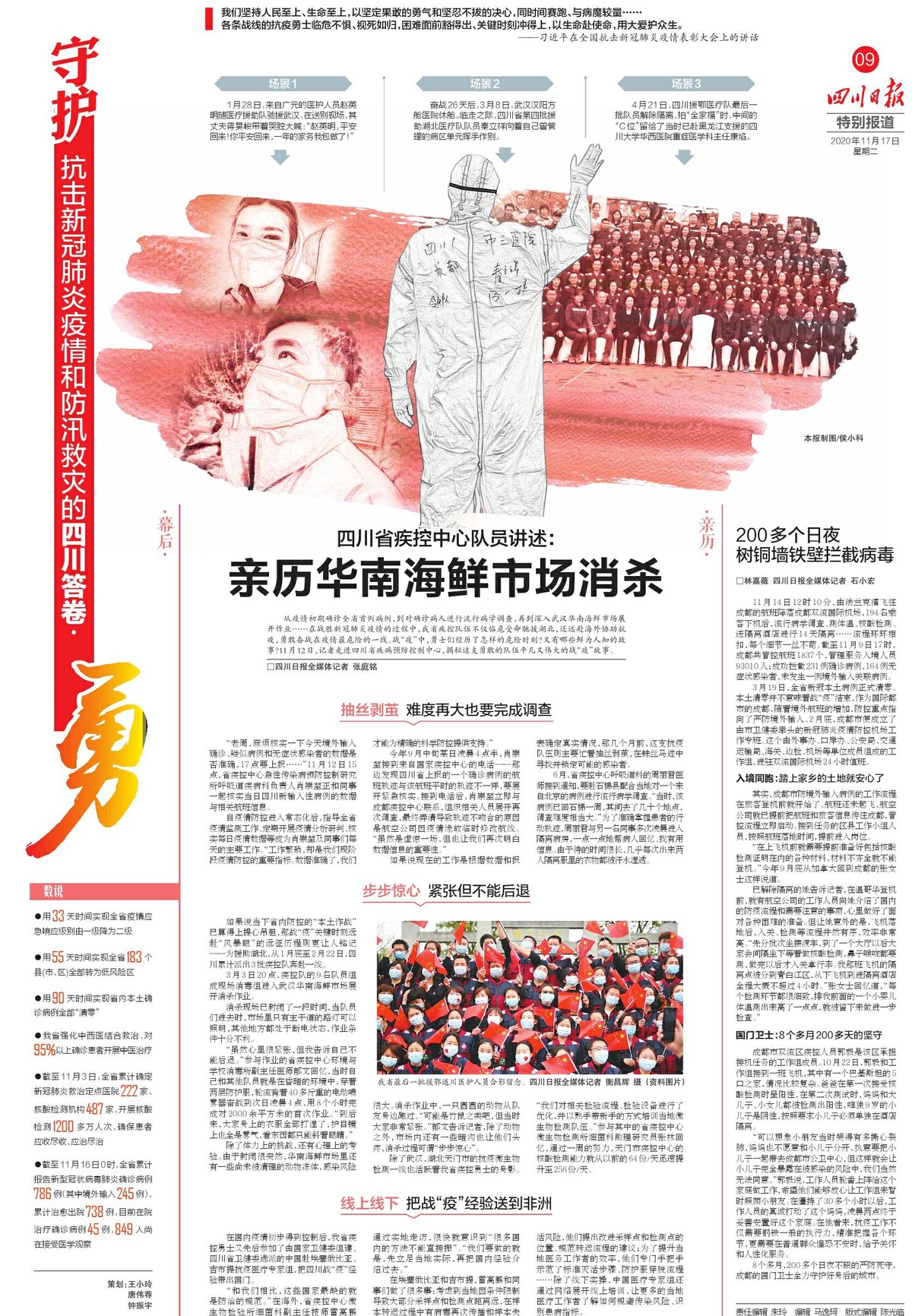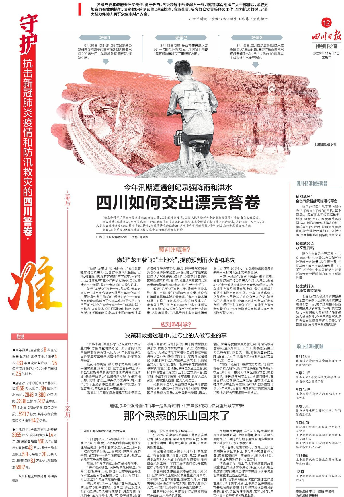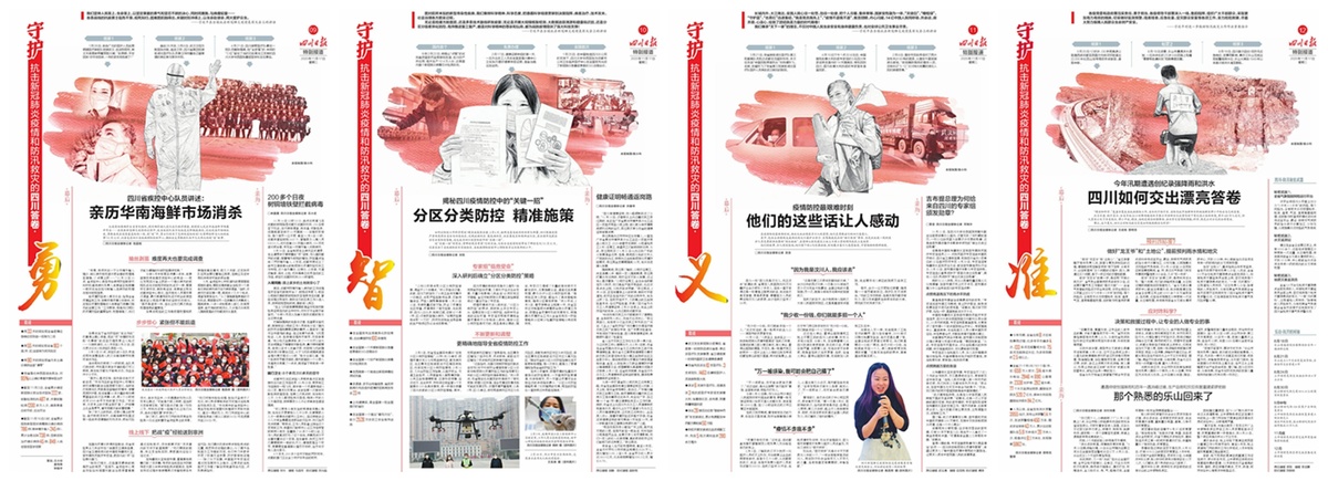 今天,11月17日出版的四川日报,除了一版的长篇通讯和社论,还特意推出四个整版的特别报道,四个版分别冠以“勇、智、义、准”四个字,浓缩了抗击新冠肺炎疫情和防汛救灾的四川答卷的核心要义。