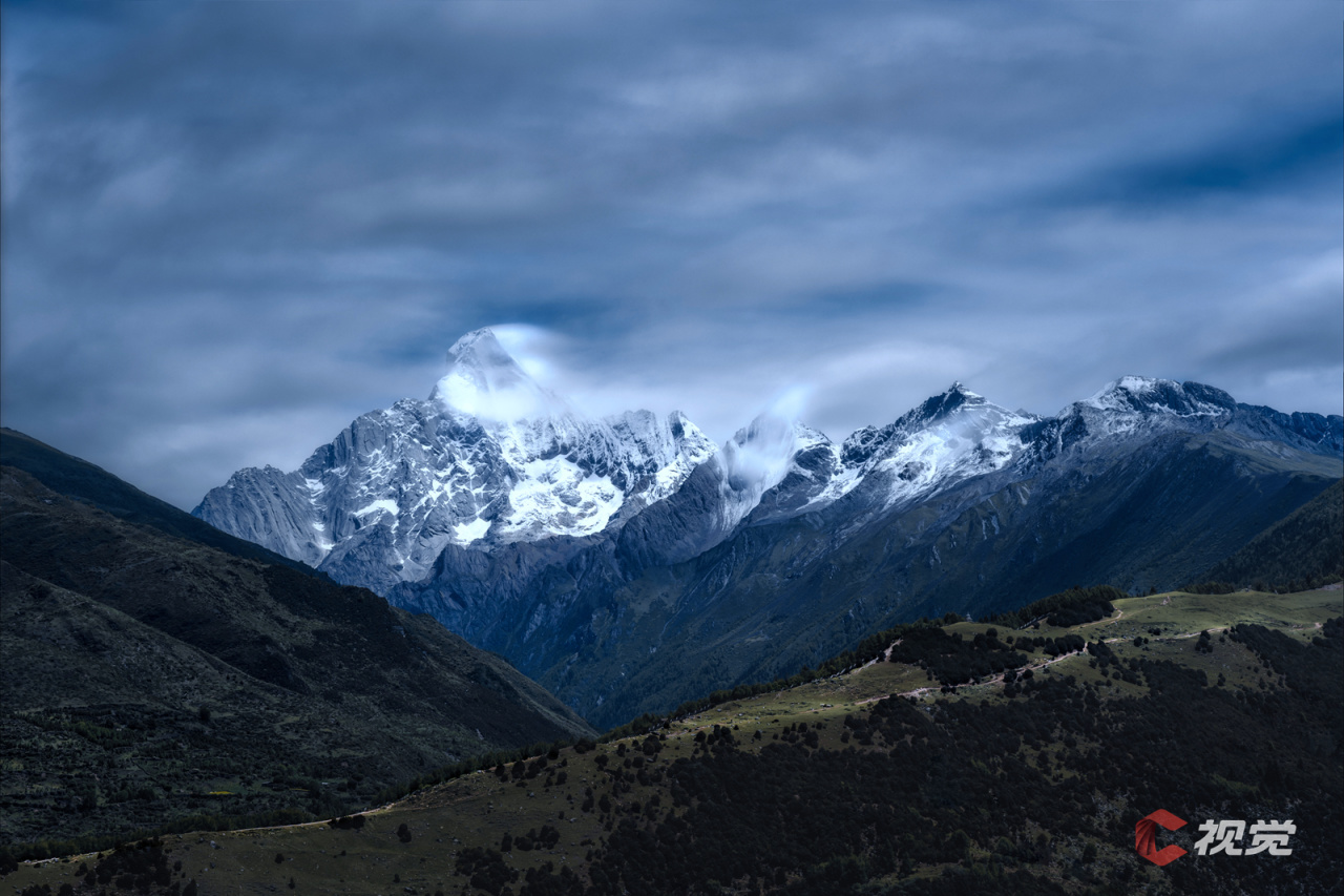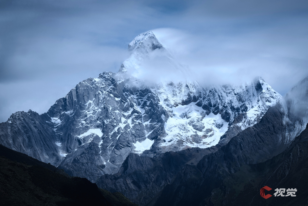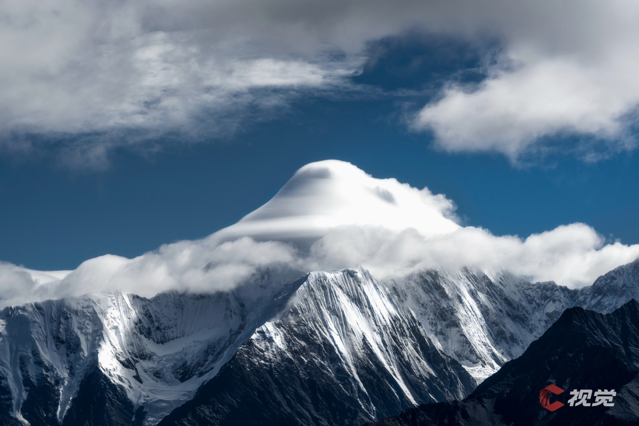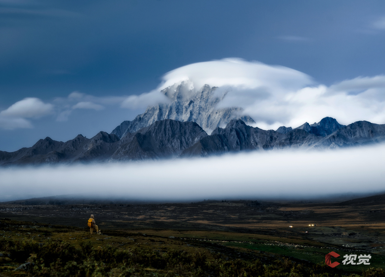 9 月 22 日,C视觉摄影师郑钰霖前往贡嘎山捕捉日照金山和星空的美景,因天气原因未能如愿。第二天清晨,他再次来到子梅垭口守候,意外捕捉到了罕见的贡嘎山帽子云。贡嘎山的每个峰顶都被小巧的帽子云环绕,而主峰上的帽子云尤为独特,云层紧紧缠绕着山顶,宛如流水般的缠绕方式,景象壮观无比。