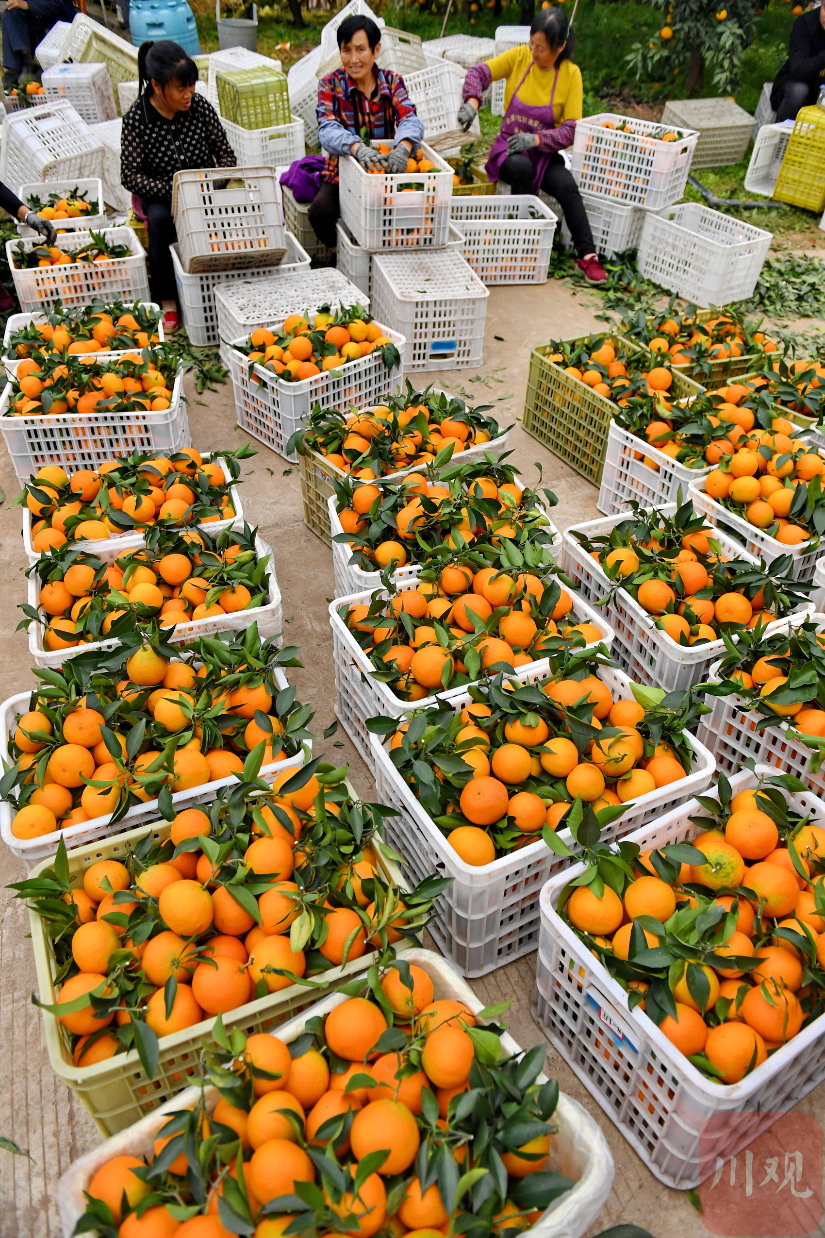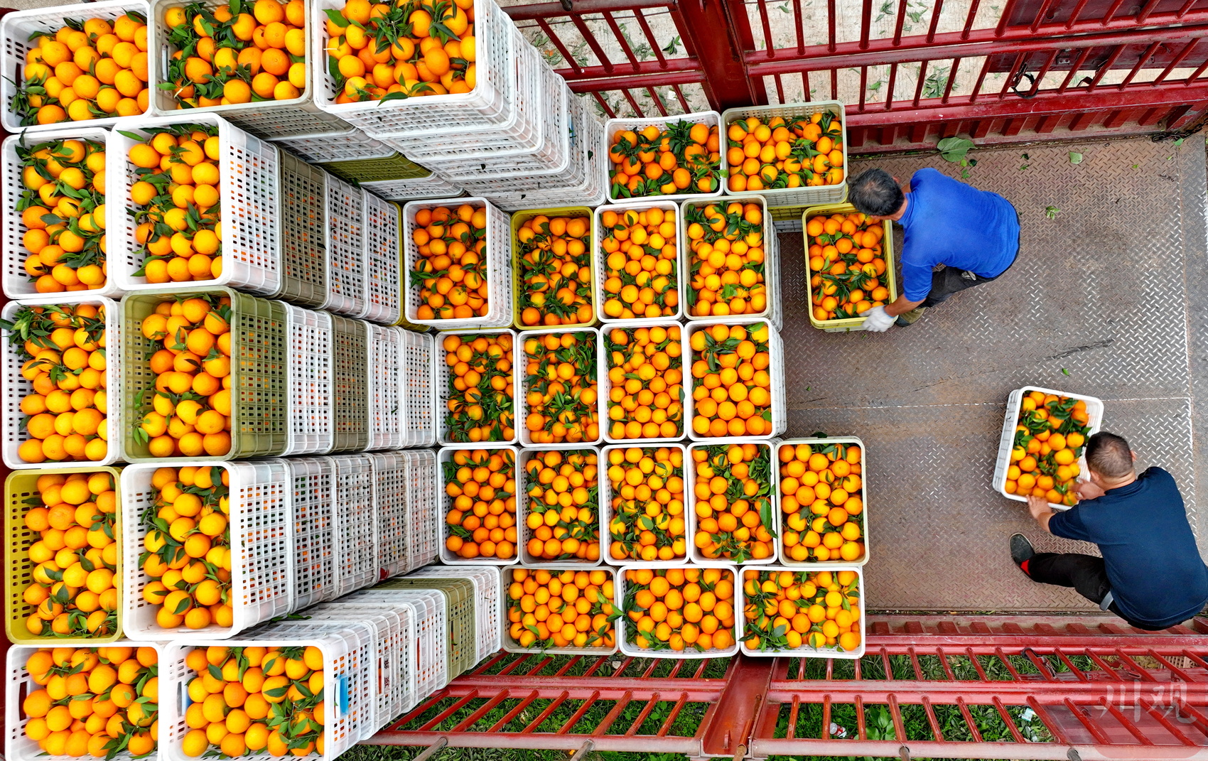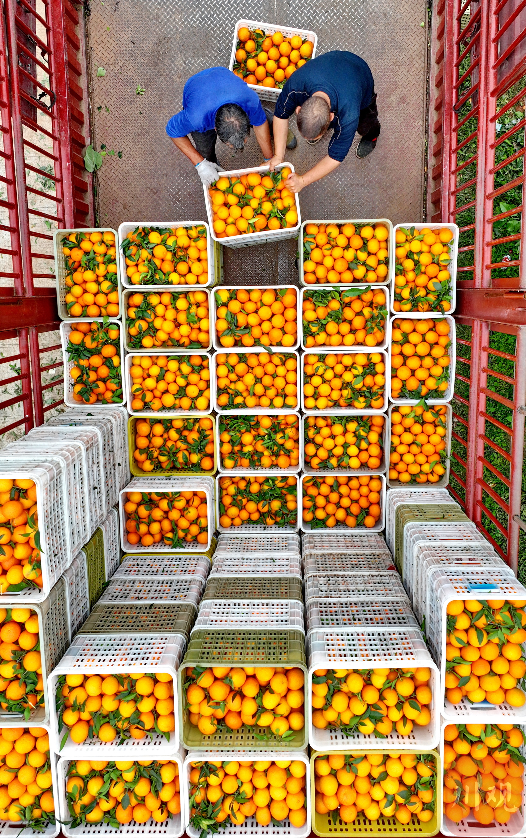 在成都市双流区永安镇梨园村柑橘种植基地,工作人员正在忙碌装运成熟柑橘。