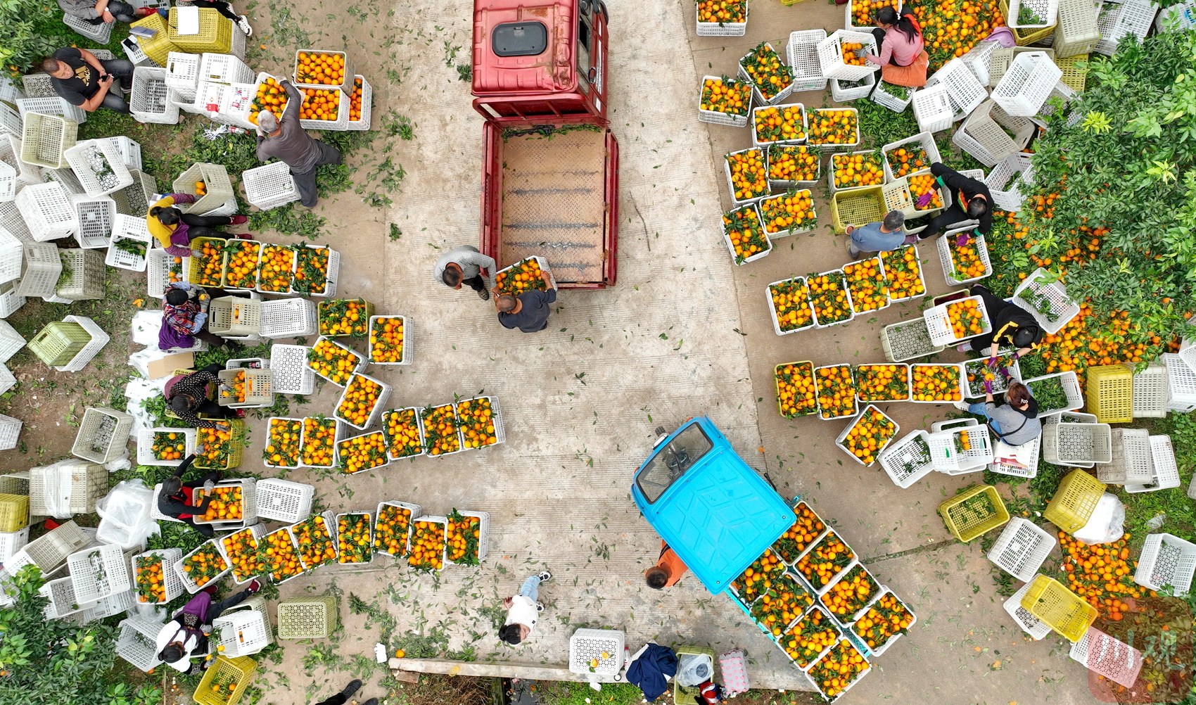 10月24日,在成都市双流区永安镇梨园村柑橘种植基地,工作人员正在忙碌采摘、装运成熟柑橘。目前,成都市双流区永安镇柑橘种植园进入成熟收获期,来自多地的批发商现场收购柑橘,田野中呈现出一片繁忙景象。