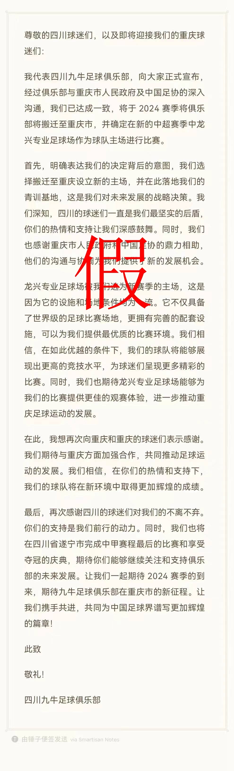 还有一个名为“山城楼市PLUS”的自媒体微信公众号更转发了这份声明并在文中言之凿凿地说“这份声明基本算是实锤”,而该文章标题为“突发!四川九牛足球俱乐部即将搬到重庆?龙兴板块要起飞了”,让人不得不怀疑,这是有人在故意炒作骗取流量。