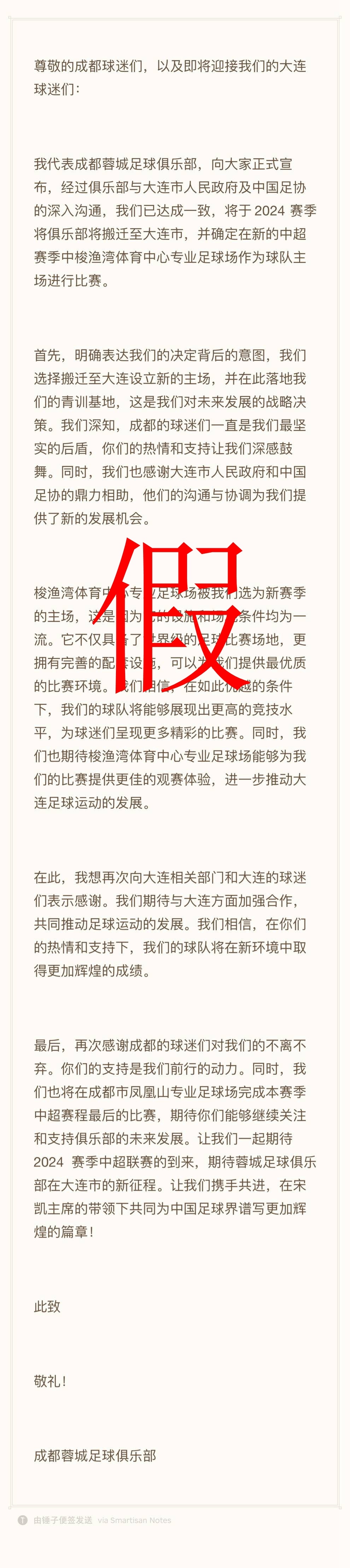 更令人啼笑皆非的是,与此同时,网上还流传着一份“成都蓉城足球俱乐部”的声明,声明大意为,成都蓉城将把主场搬迁至大连梭鱼湾体育中心,而该声明的截图模本,与四川九牛流传的这则声明一模一样,不知道是谁套用的谁。