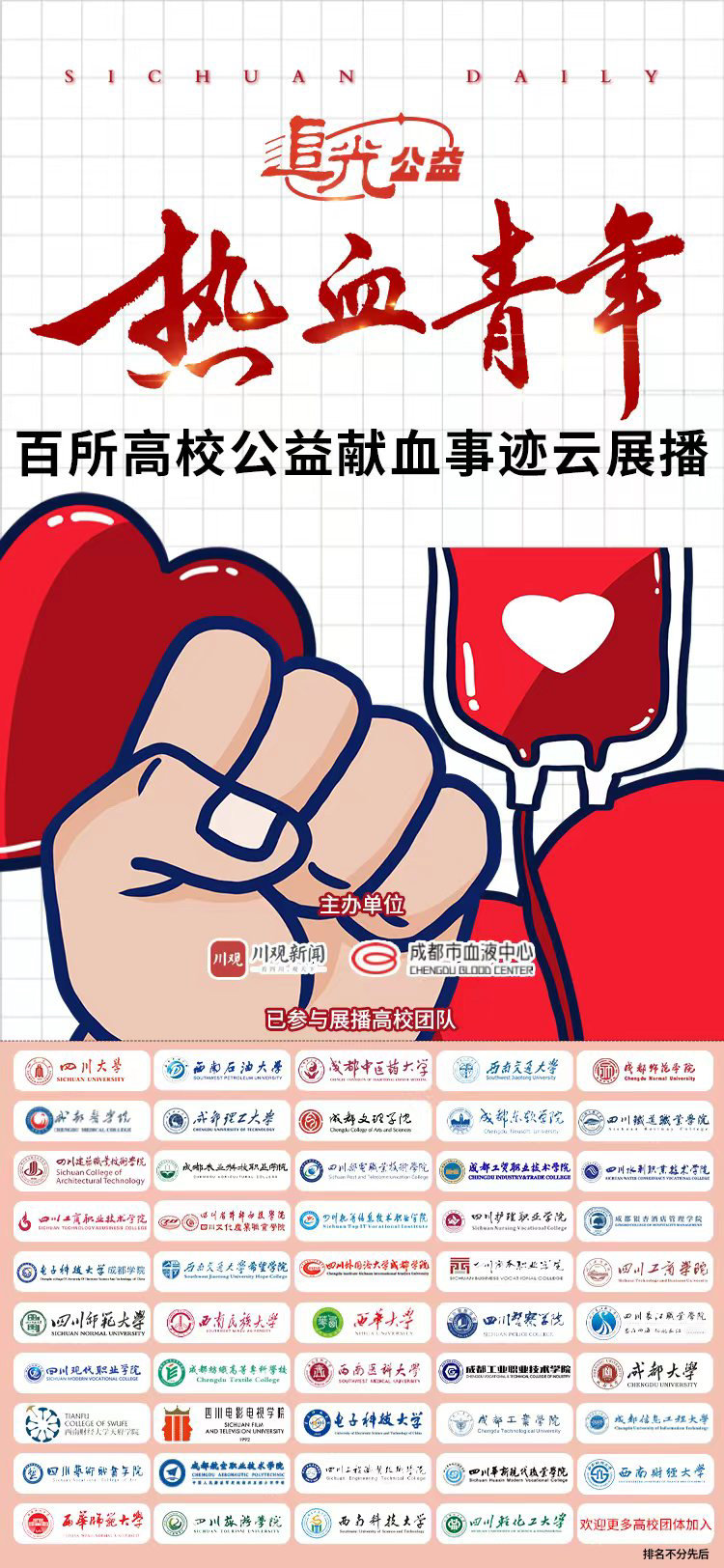 3、优质社会实践机会:参与展播且助力情况靠前的团体,推选的部分学子将:①优先获得成都市血液中心社会实践机会;②优先入选川观新闻“川观合伙人” 。