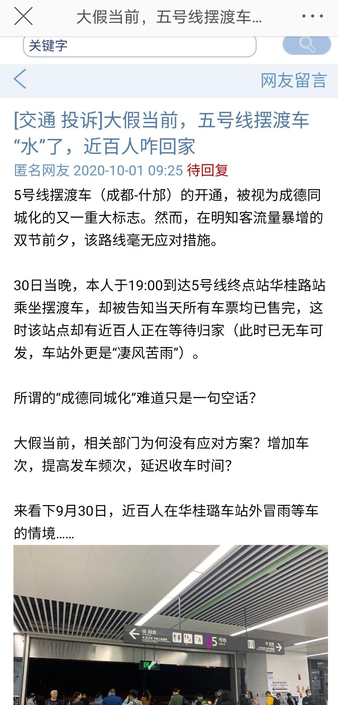 除了“什邡到成都”一到节假日就“发车困难”,“成都到什邡”也曾出现过类似问题,记者梳理发现,今年国庆节前夕,就有网友通过问政四川平台反映,5号线华桂路站滞留上百乘坐摆渡车的旅客。