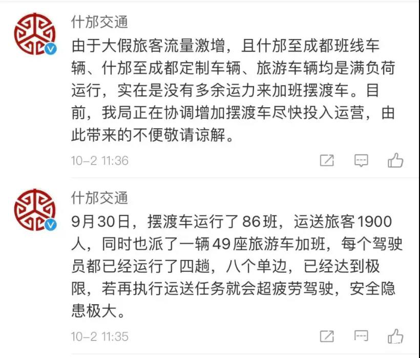 当时什邡交通局通过微博回应称:“实在没有多余运力来加增摆渡车。”