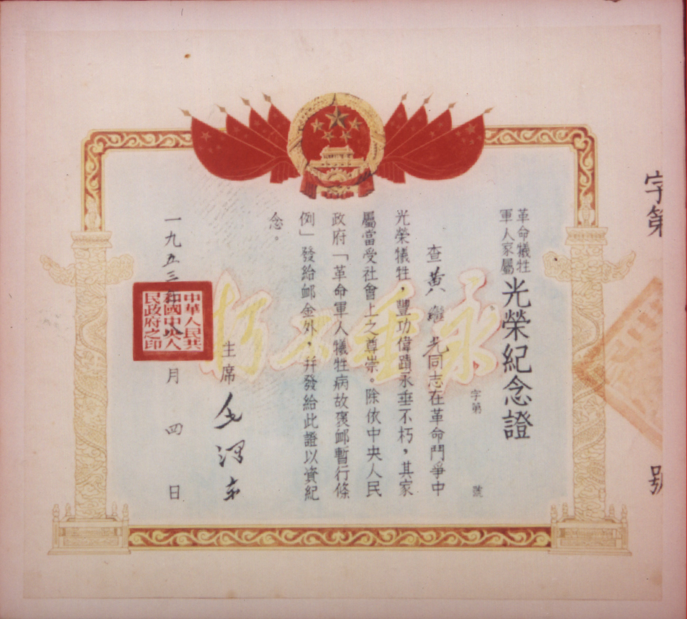 毛泽东主席签发的黄继光革命牺牲军人家属光荣纪念证。 中江县档案馆供图