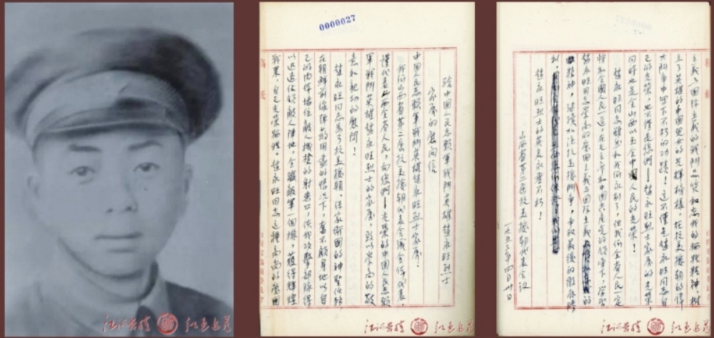 1953年4月30日,山西省抗美援朝分会给中国人民志愿军战斗英雄赵永旺烈士家属的慰问信 。山西省档案馆供图