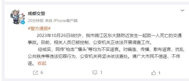 2023年10月26日8时许,我市锦江区东大路附近发生一起致一人死亡的交通事故。目前,相关人员已被控制,公安机关正依法开展调查工作。