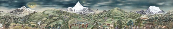 刘洪介绍,《香巴拉画卷》用的是唐卡的矿物原料,青山、树木、花卉借鉴了国画中的青绿、水墨山水画的技法,雪山、天空、岩石、人物则具有油画的写实特点以及色彩上自由大胆的表现,寺院、民居、湖泊、动物等则传承延续了藏族唐卡噶玛嘎孜画派施色浓重、对比强烈、画面富丽堂皇的风格。