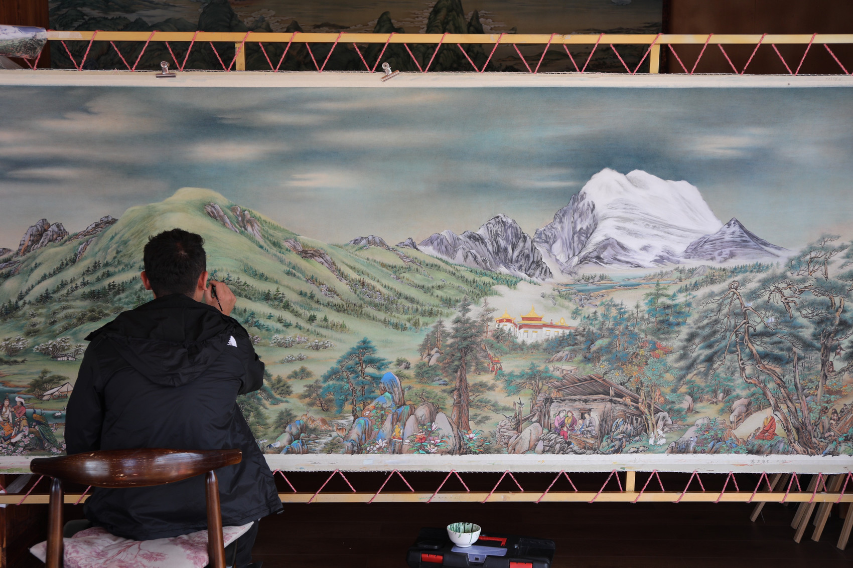 “在一幅画中,既看到唐卡的工笔,又有国画的意境,还有油画的写实,让人耳目一新。”游客在欣赏《香巴拉画卷》时这样评价。