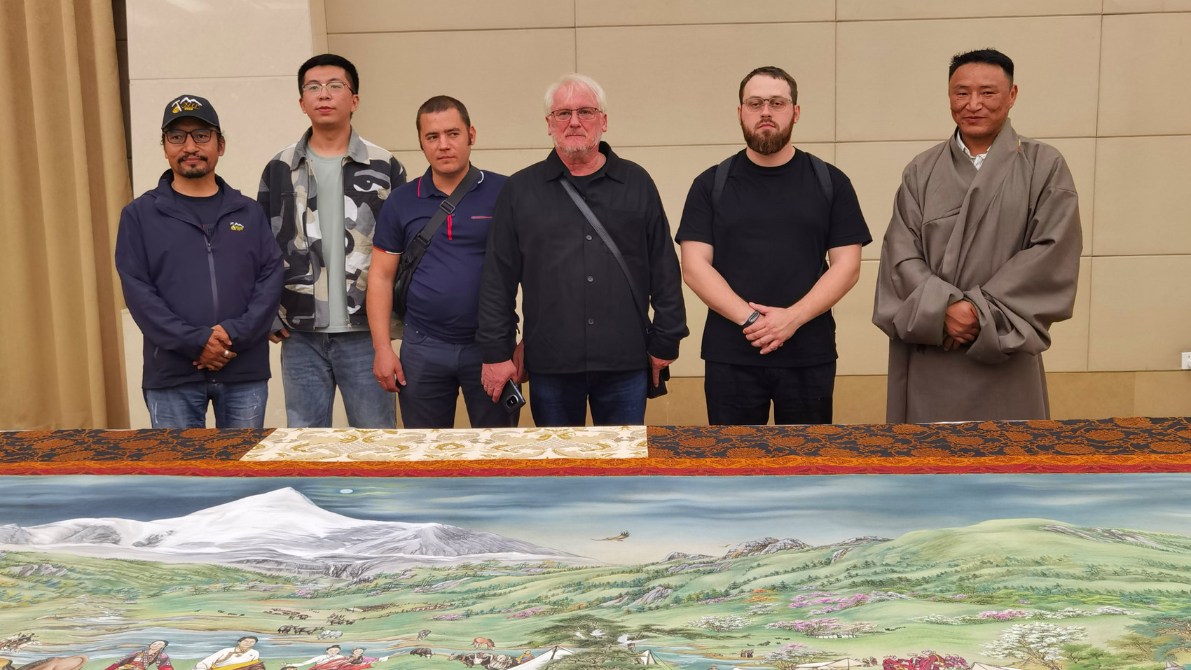 呷绒翁都(右)与俄罗斯列宾美术学院画家等在《香巴拉画卷》前合影(川观新闻记者 田为 摄)