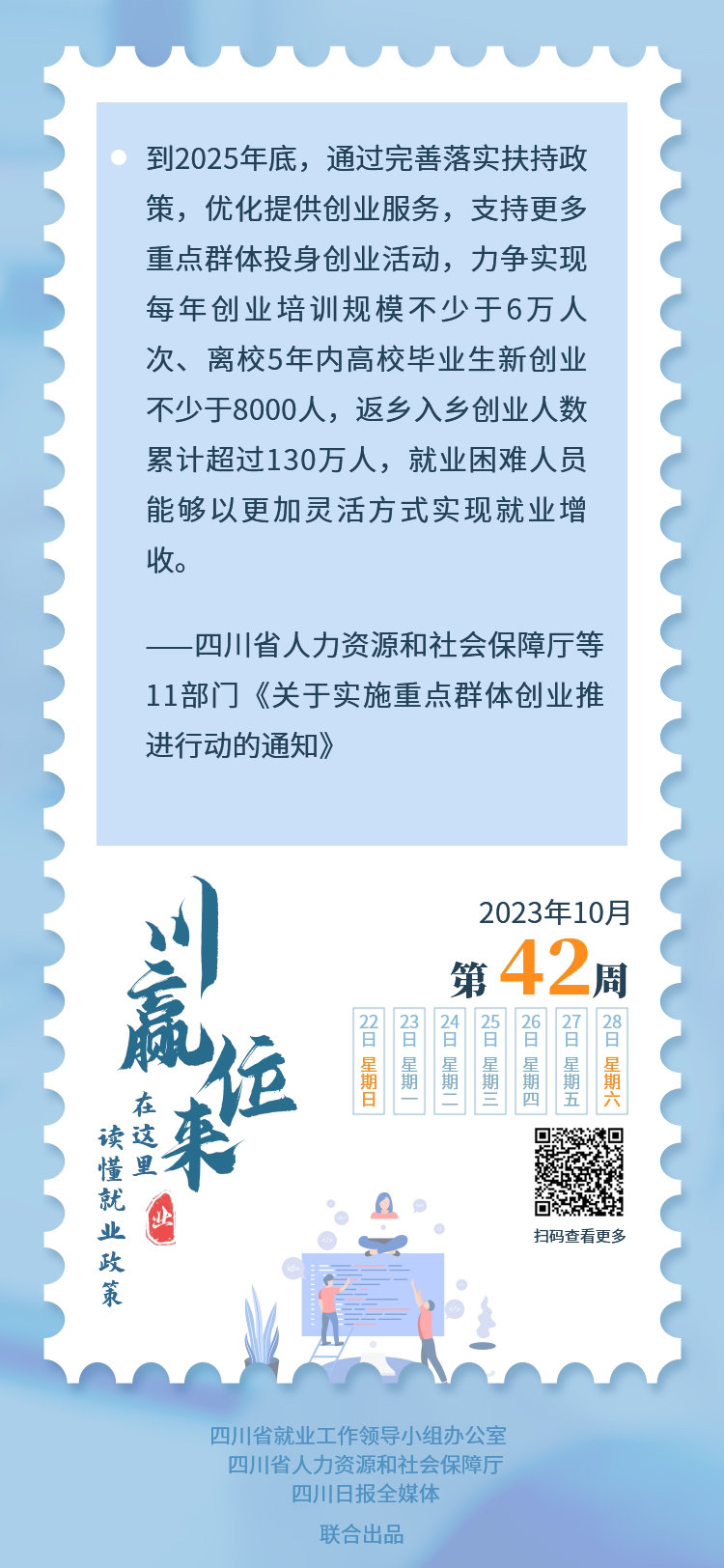 前不久,四川省人力资源和社会保障厅、四川省发展改革委、四川省经济和信息化厅等11部门联合发文,决定全省实施重点群体创业推进行动。哪些人群是重点群体?有哪些措施来推进重点群体创业?本期的“川赢位来.就业政策周历”,我们一起来分享更多信息。