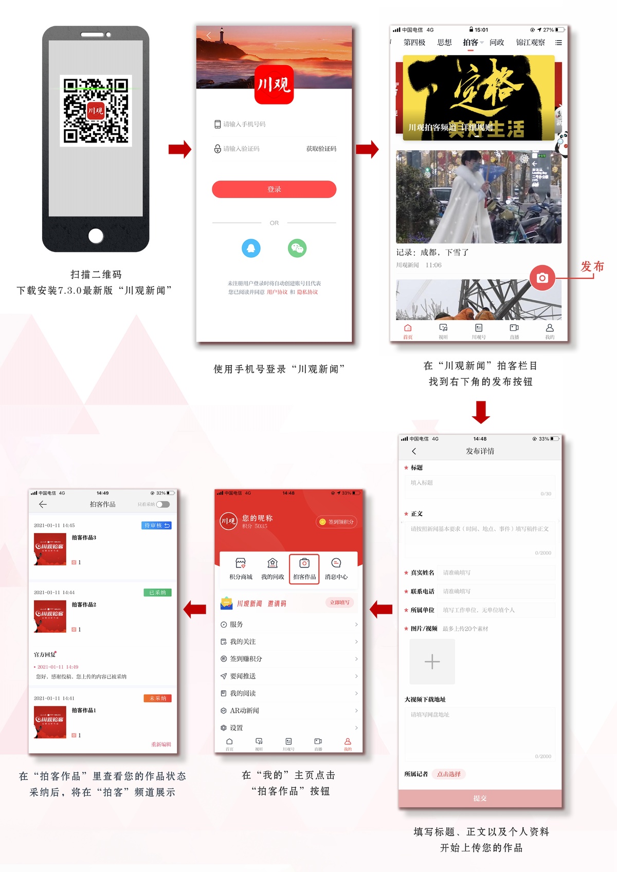 您上传后经审核发布的作品将在川观新闻app上展示,优质作品将推发至川报全媒体各渠道。您将有机会与川报全媒体采编团队开展深度交互,参与各大重要内容生产。