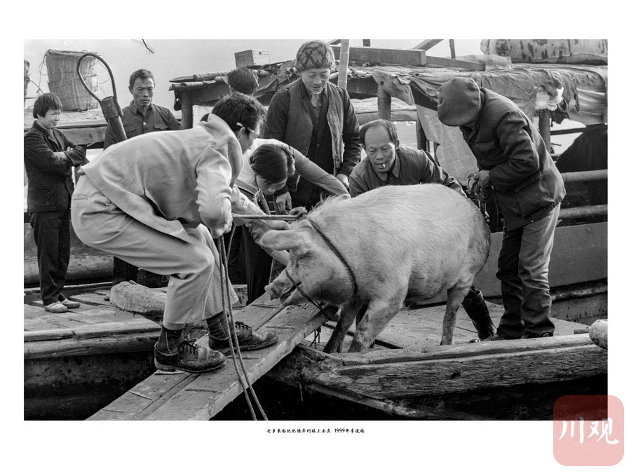 1999年,乡下人乘船把肥猪弄到镇上去卖。杨麾 摄