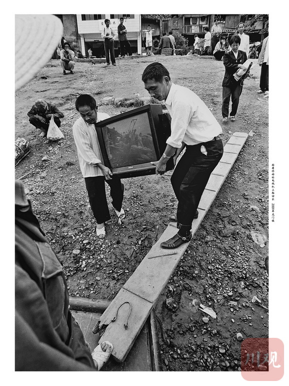 2001年,村民抬着修好的电视机上船回家。杨麾 摄