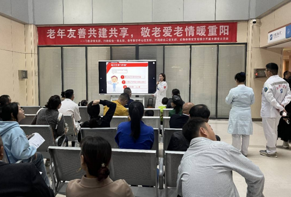 上午9点,30余名来自医院行政后勤的党员、职工身着红色志愿马甲分散到医院各处,指导老年患者通过自助机挂号缴费、打印检查报告,引导老人就诊取药,为无家属陪伴的老年人提供一对一陪诊服务......在与老人交流时,主动询问老人的就诊体验,受到很多老年患者及家属对医院服务、设施、流程的高度肯定,也收集到更好推进老年友好型医院建设相关的中肯意见、建议。在门诊二楼候诊区,来自急诊科、老年医学科、骨科等多科室的医生为候诊患者及家属开展老年相关疾病健康知识讲座,并进行现场知识问答互动,为老人们送上健康“小礼”。 在门诊广场,来自急诊科、老年医学科、骨科等科室的医务人员为老年人们免费进行血压测量和诊后咨询、用药咨询,指导老人们如何健康饮食和锻炼。