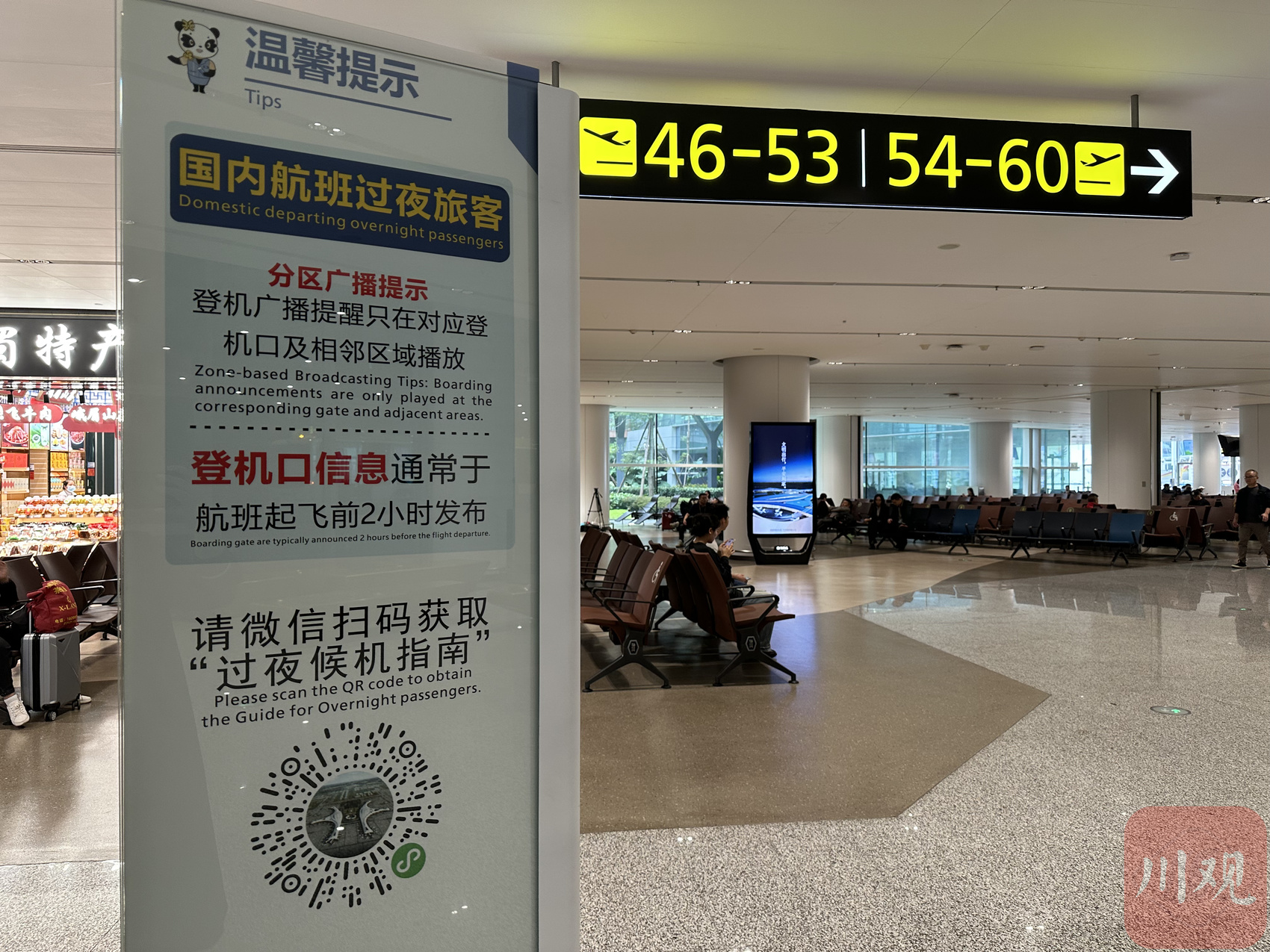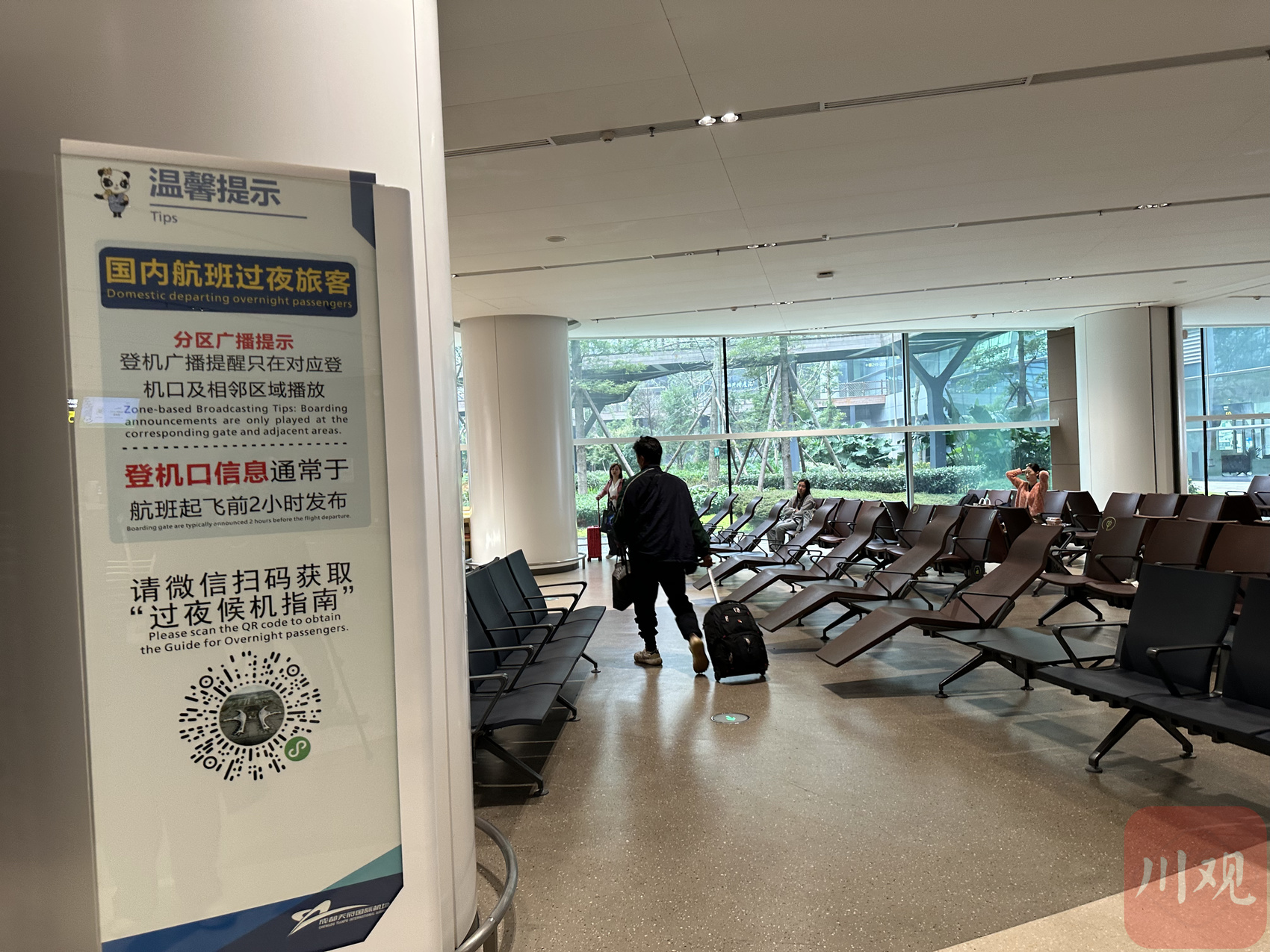 原来,登机口信息一般在飞机起飞前2小时发布,过夜旅客到达机场并办理相关手续的时候,“在哪个登机口登机”尚不明确;此外,飞机起飞前会有登机广播提醒,而这一提醒往往在对应的区域播放。天府国际机场候机楼大,“过夜旅客休息区”设置在相对安静的区域,登记广播提醒难以完全覆盖。为避免过夜旅客忽略这些信息,天府国际机场特意制作了“温馨提示”,放在“过夜旅客休息区”的醒目处,提醒旅客关注登机信息,避免误机。