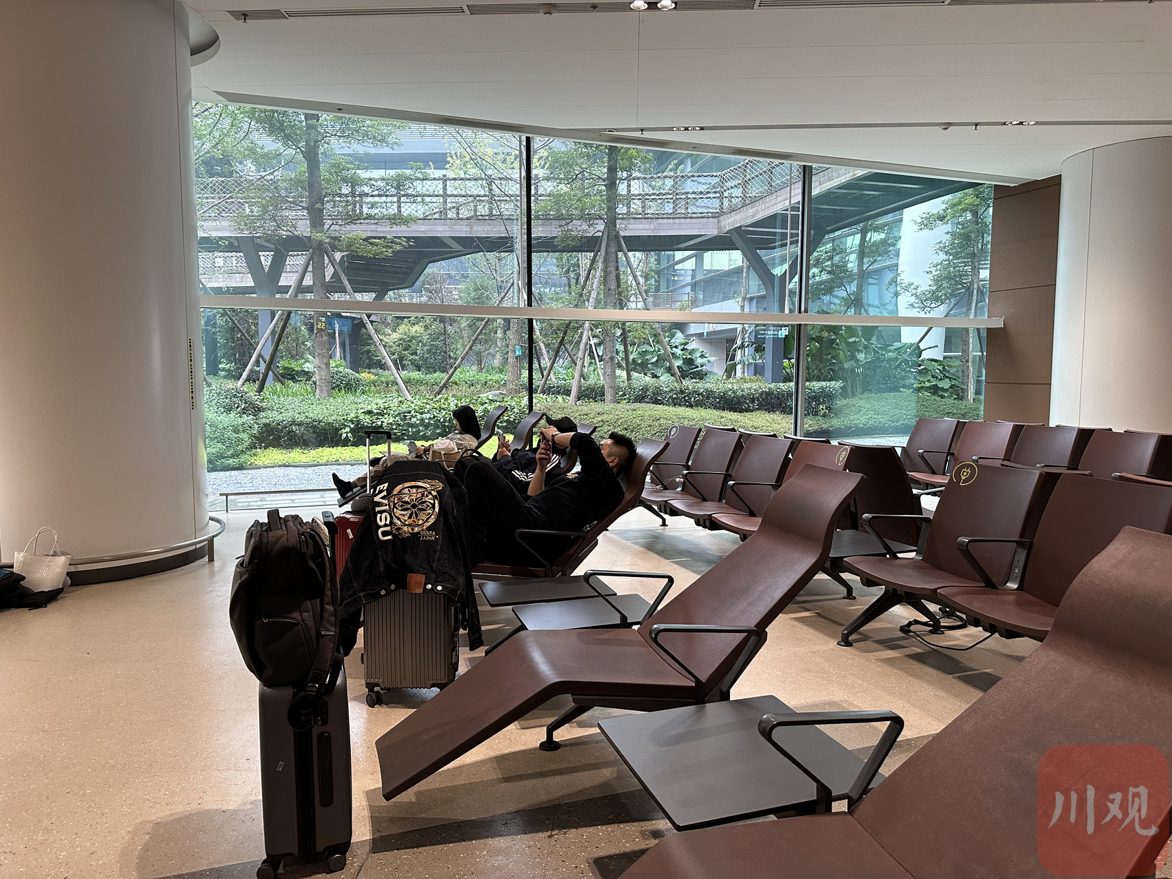 惊艳的不只是老万。这天并不是节假日,但候机楼里人头攒动,出港旅客一波接一波。休息区里,陆续有旅客到来,躺着小憩,同一个躺椅,换了几轮人躺。