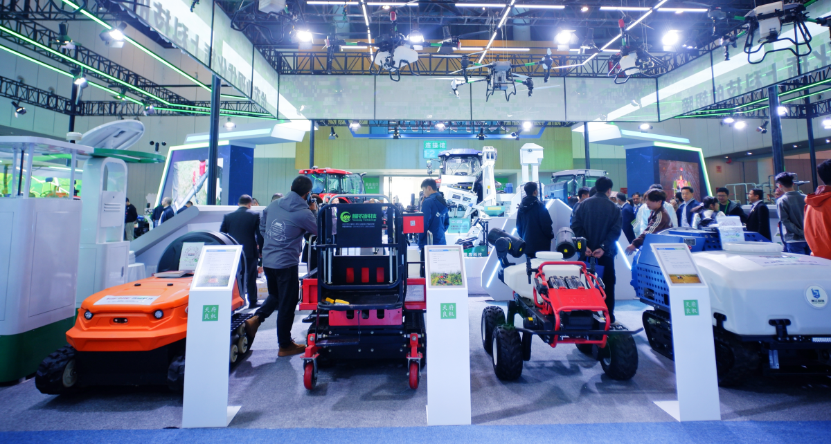 在智能绿色农机装备展区,这里有国内主流的大疆、极飞、极目等品牌的8个型号具备喷药、施肥、播种功能的无人机,有配套拖拉机使用的无人驾驶控制系统,它们能够自动完成预先设定地块的植保、耕地、播种、中耕等任务。