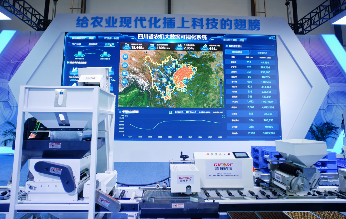 在平原农机装备展区,这里展示的8行高速乘坐式水稻插秧机作业效率达每小时10亩以上。油菜毯壮苗旱地移栽机则是提升我省油菜种植机械化的生力军,可一次性完成旋耕埋茬、中间开沟、对缝栽插等全套工序。而“四川造”的6行精量联合播种机是适应四川油菜直播农艺需求而研发的农机,每小时作业效率达4到6亩。当前,成都平原主要农作物综合机械化率达82.5%以上,走在全省前列,离不开这些农机装备的支撑。