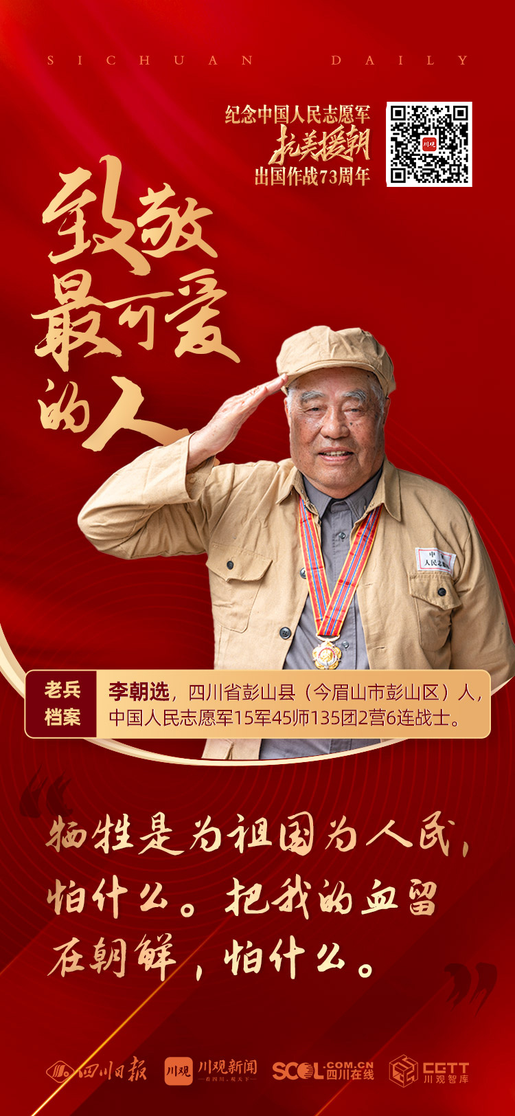 李朝选,四川省彭山县(今眉山市彭山区)人,中国人民志愿军15军45师135团2营6连战士,与黄继光是战友。1951年3月入伍,曾参加上甘岭战役。