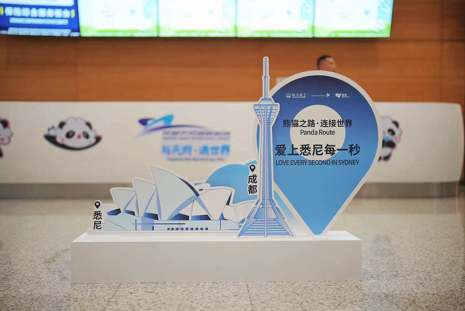 首航当天,川航携手澳大利亚新南威尔士州旅游局,在成都天府国际机场T1航站楼内为旅客布置打卡拍照墙,并准备精致的首航伴手礼。