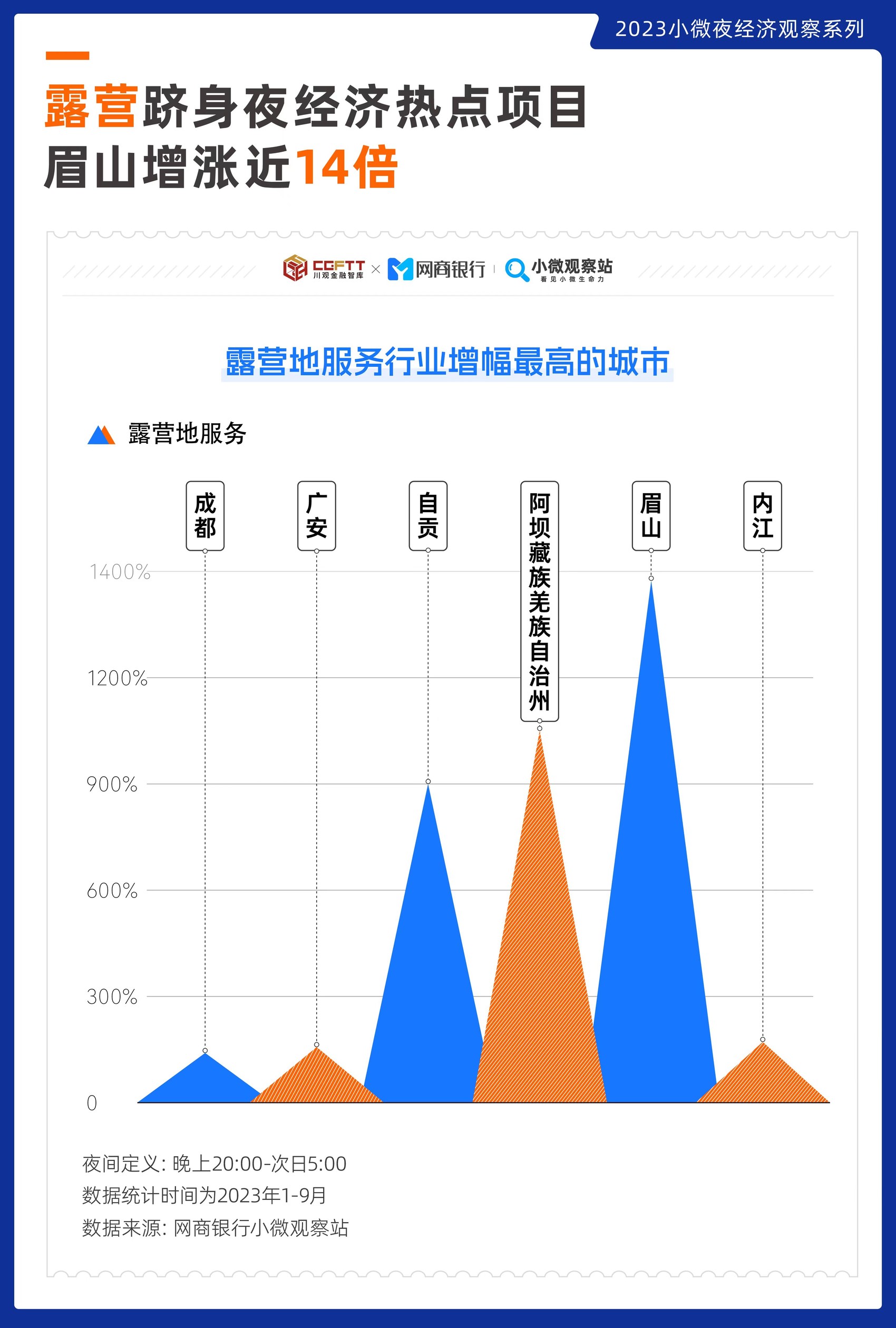 网商银行小微观察站数据显示,露营成为四川不少城市的热点项目,今年1—9月,成都露营销售额同比增长156%,广安同比增长162%,内江同比增长167%,增幅最高的为眉山、阿坝、自贡,分别增长1390%、1129%、900%。