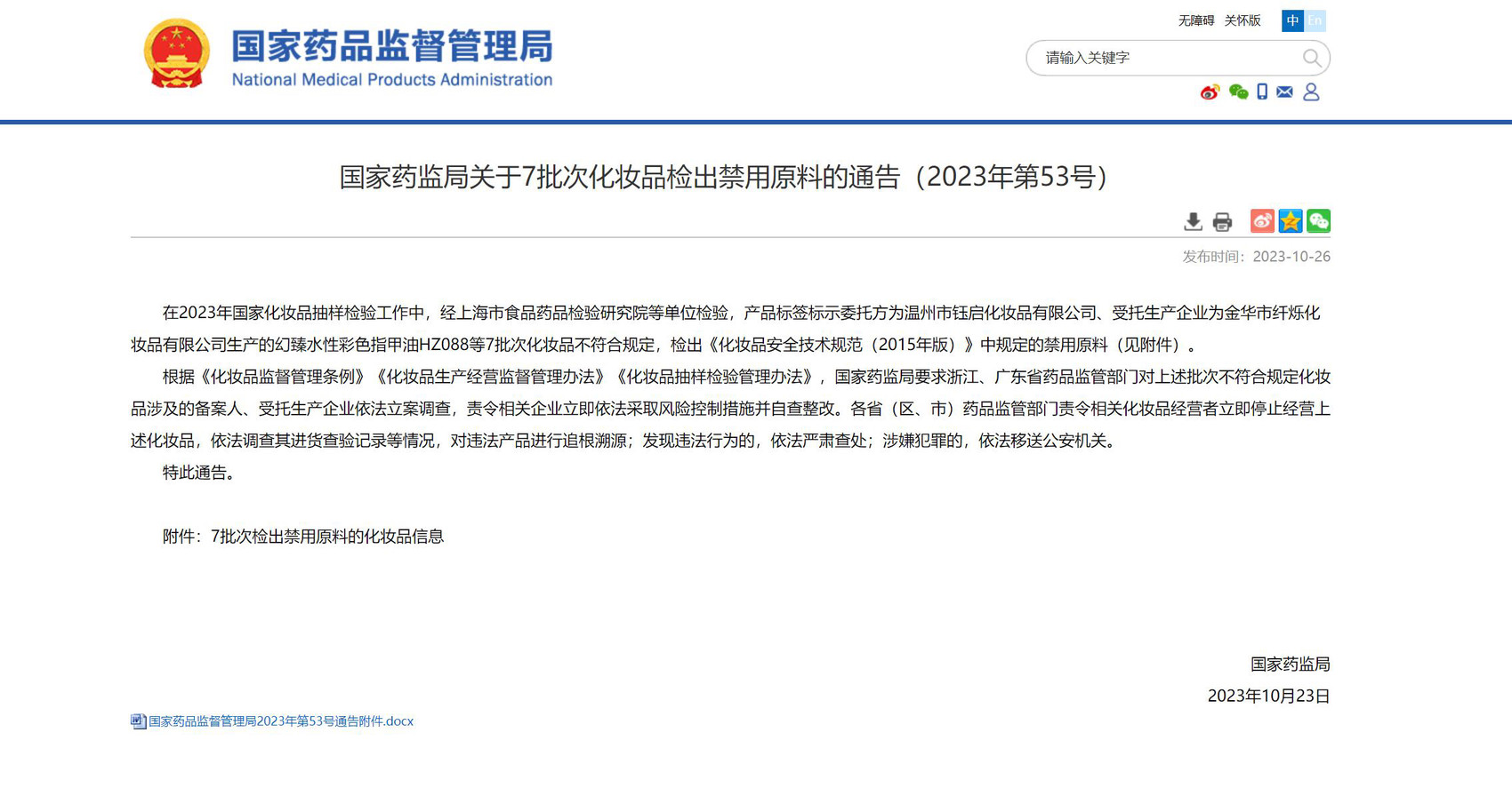 近日,记者从四川省药品监督管理局获悉,国家药监局网站发布通告,公布7批次化妆品检出禁用原料,标示名称分别是幻臻水性彩色指甲油HZ088、幻臻水性彩色指甲油HZ056、unna美甲功能胶加固胶、unna美甲功能胶底胶、贝比拉比蛋黄油、婴贝萱婴肤霜、VISIONAL威尔仕植物水润平衡素。在公布的7批次含禁用物质化妆品中,2批次是婴童产品。