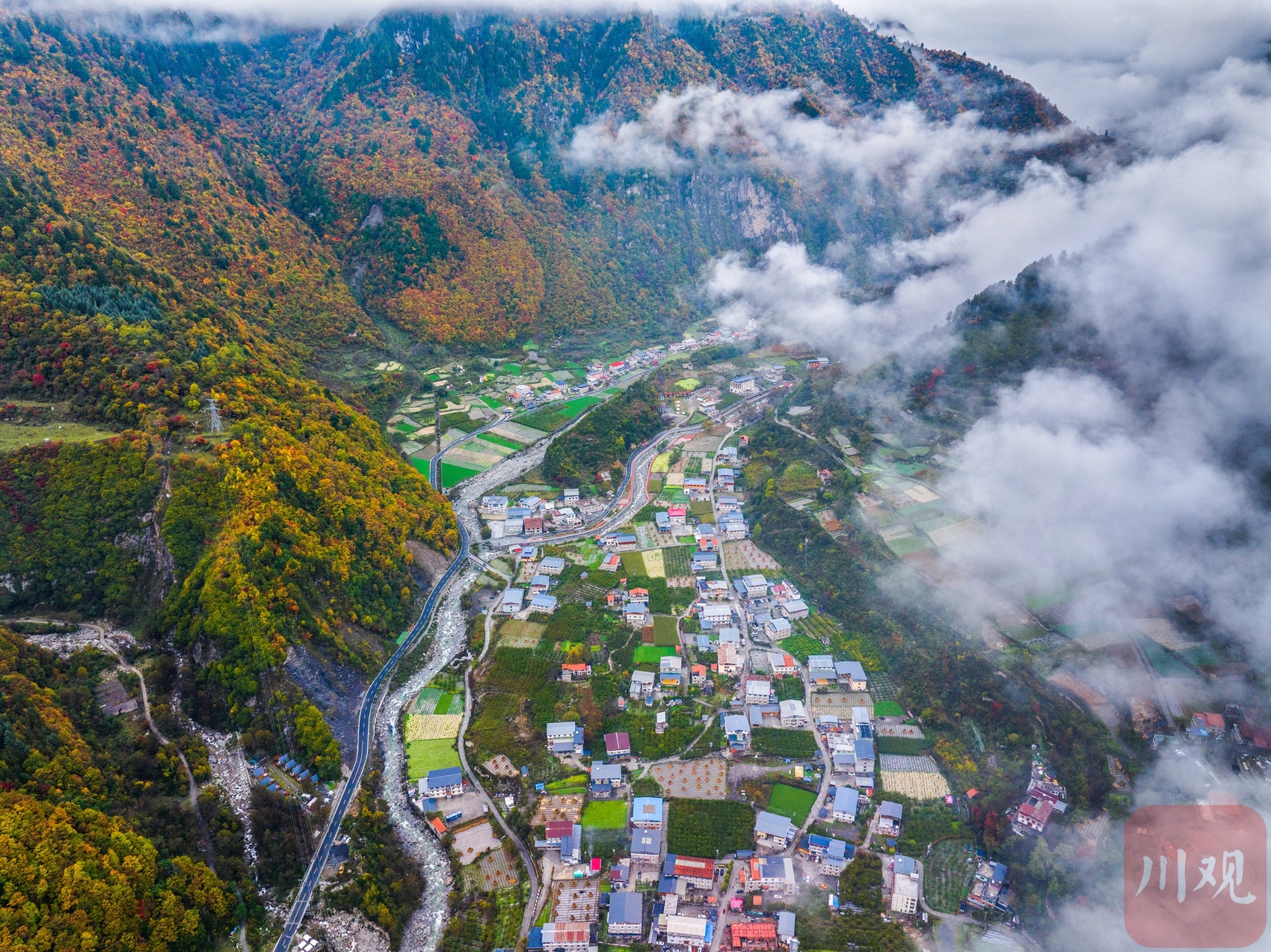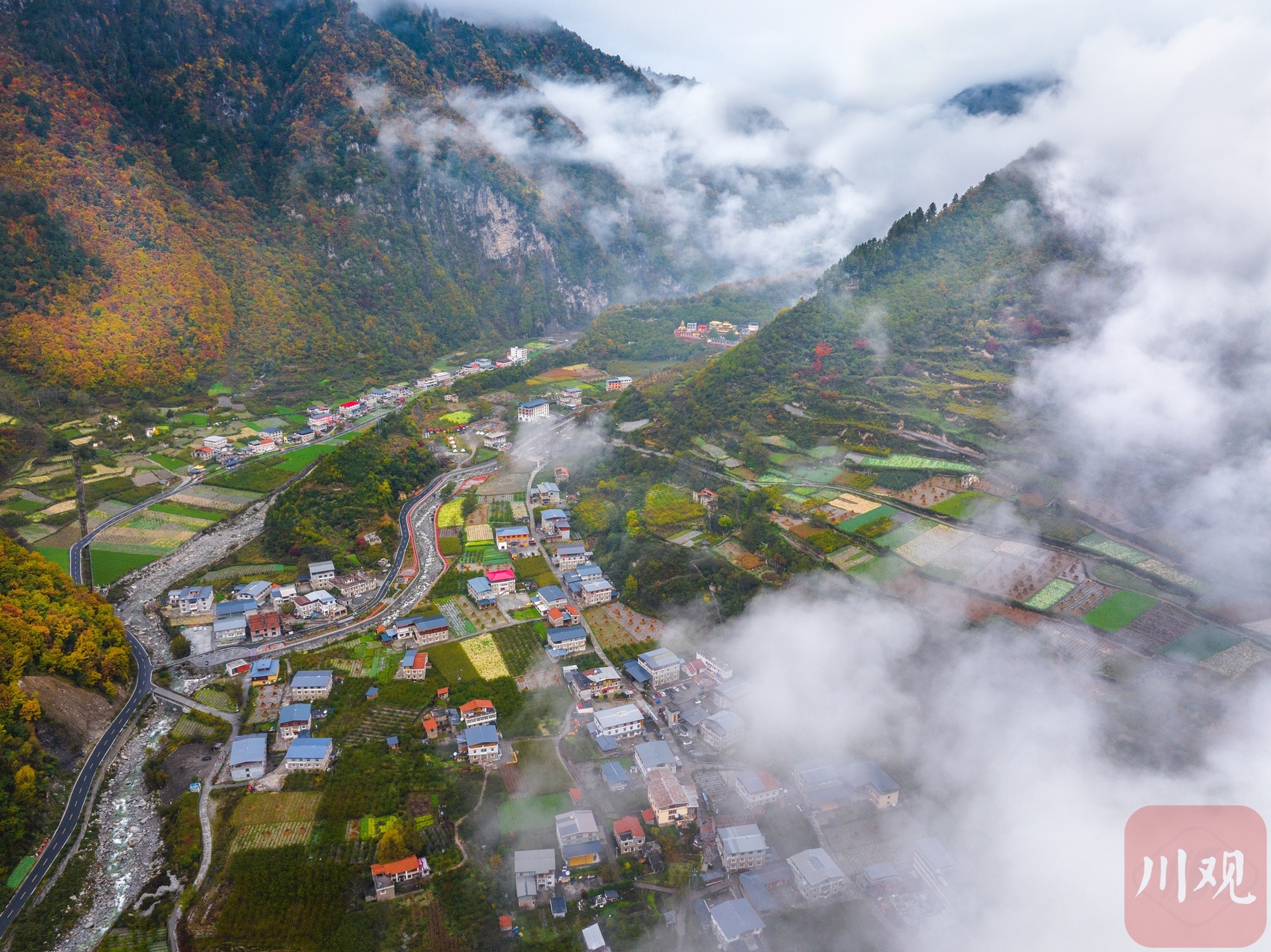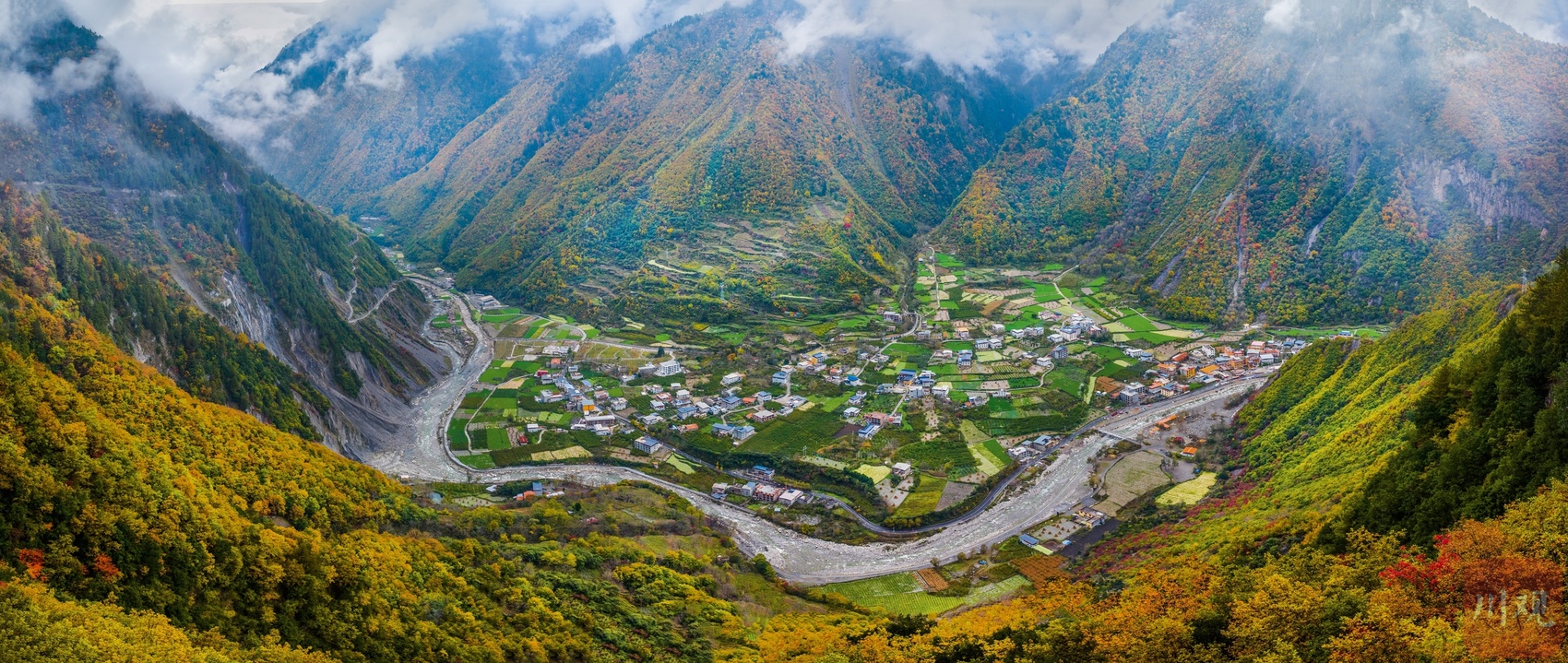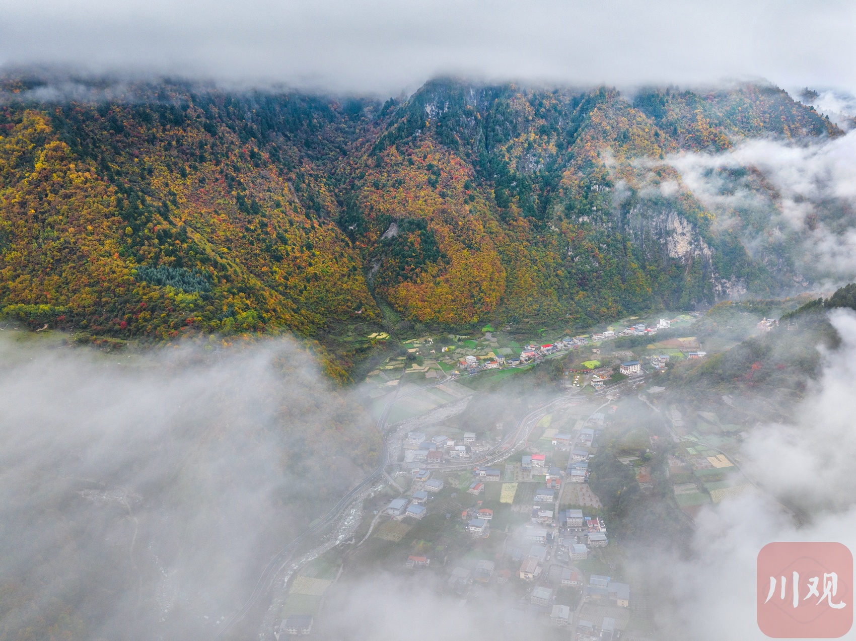 十月下旬,阿坝州理县孟屯河谷在秋天的晨雾中醒来了。群山环绕,大片大片的高山草甸已经浓墨重彩,漫山林叶披上盛装。河谷内流水徐徐,谷中的民居村庄静静卧在群山的怀抱中,安详静谧,人与自然的和谐画卷仿若一幅大师的杰作!