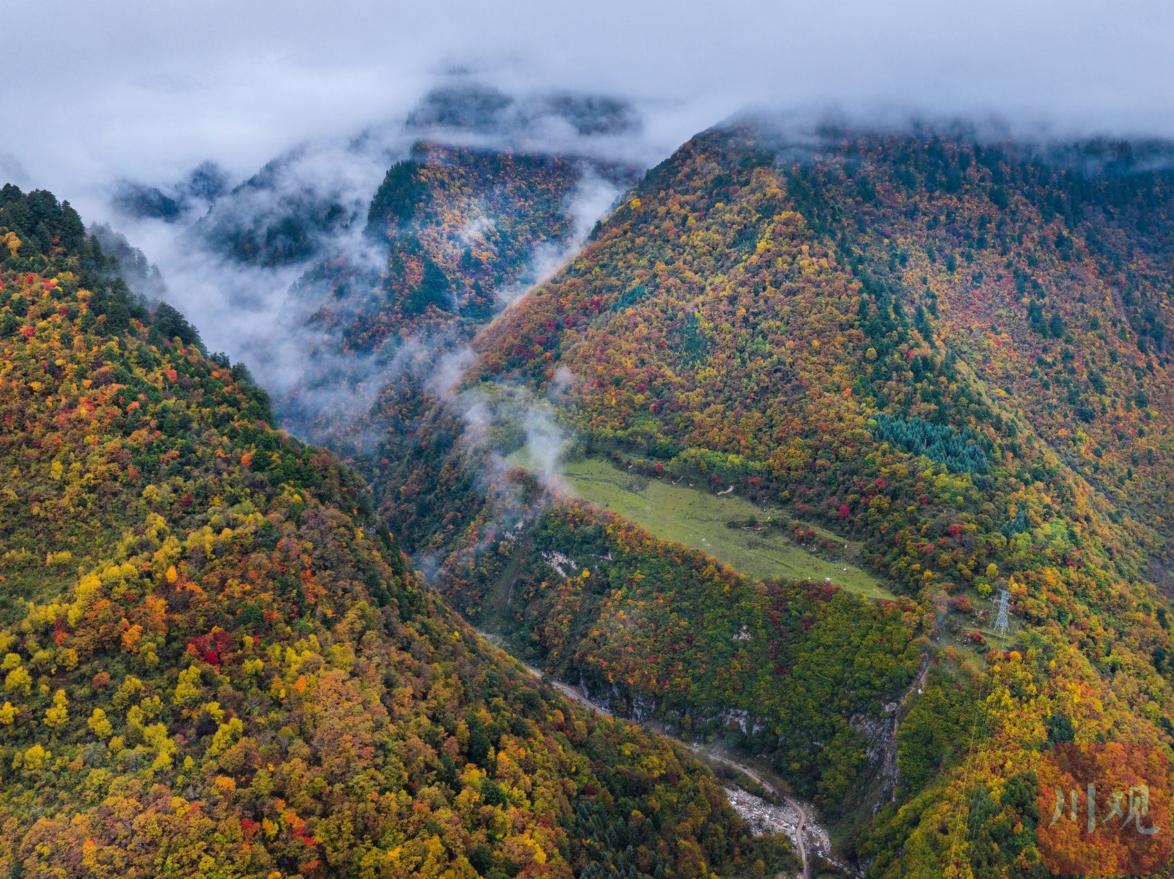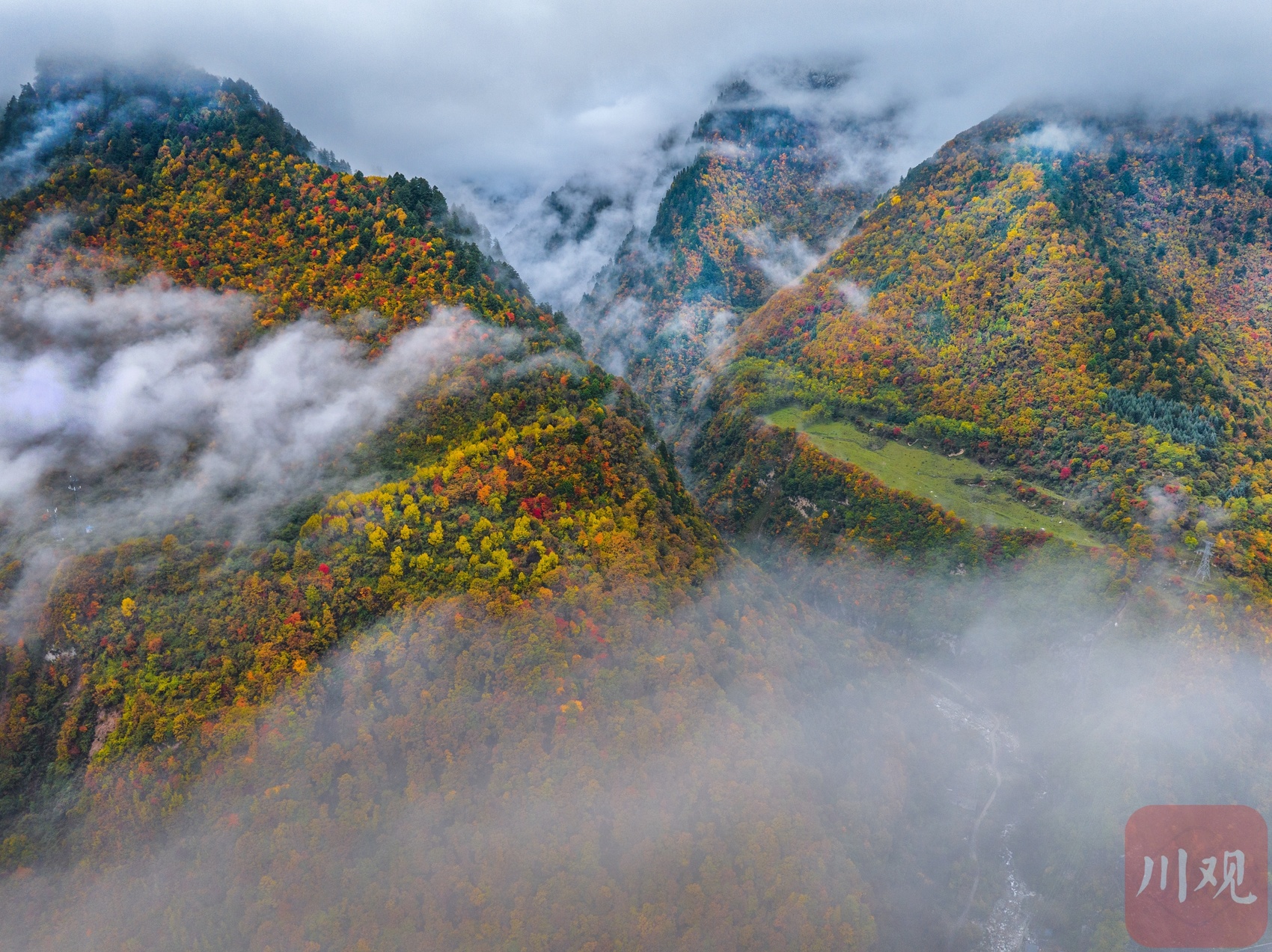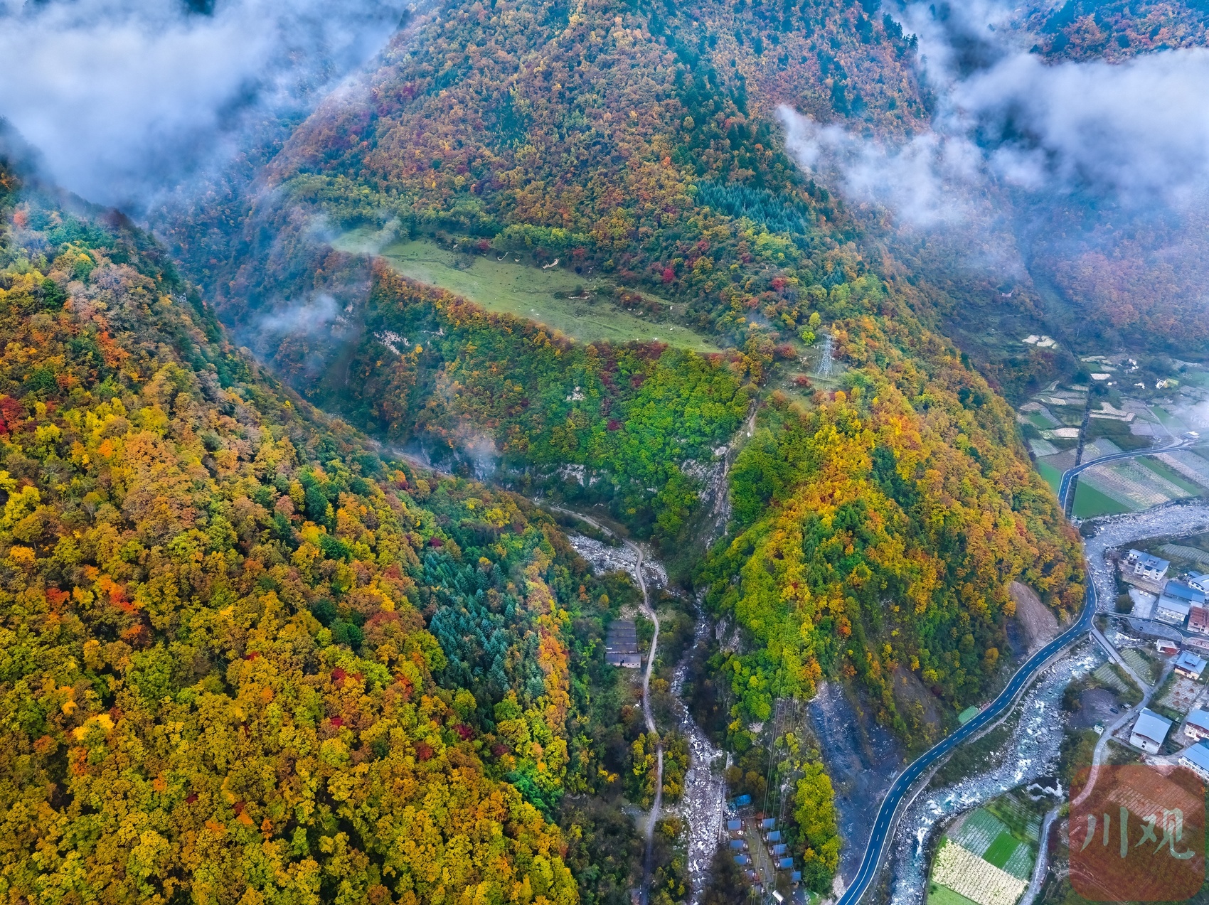 十月下旬,阿坝州理县孟屯河谷在秋天的晨雾中醒来了。群山环绕,大片大片的高山草甸已经浓墨重彩,漫山林叶披上盛装。河谷内流水徐徐,谷中的民居村庄静静卧在群山的怀抱中,安详静谧,人与自然的和谐画卷仿若一幅大师的杰作!