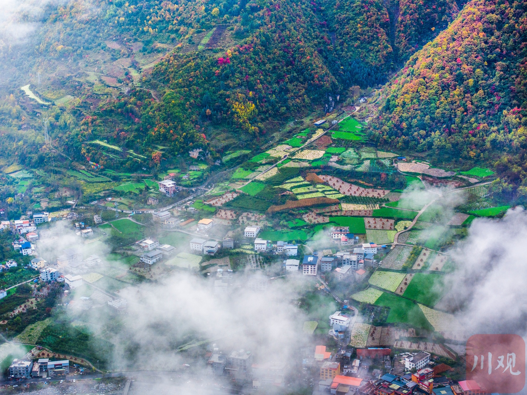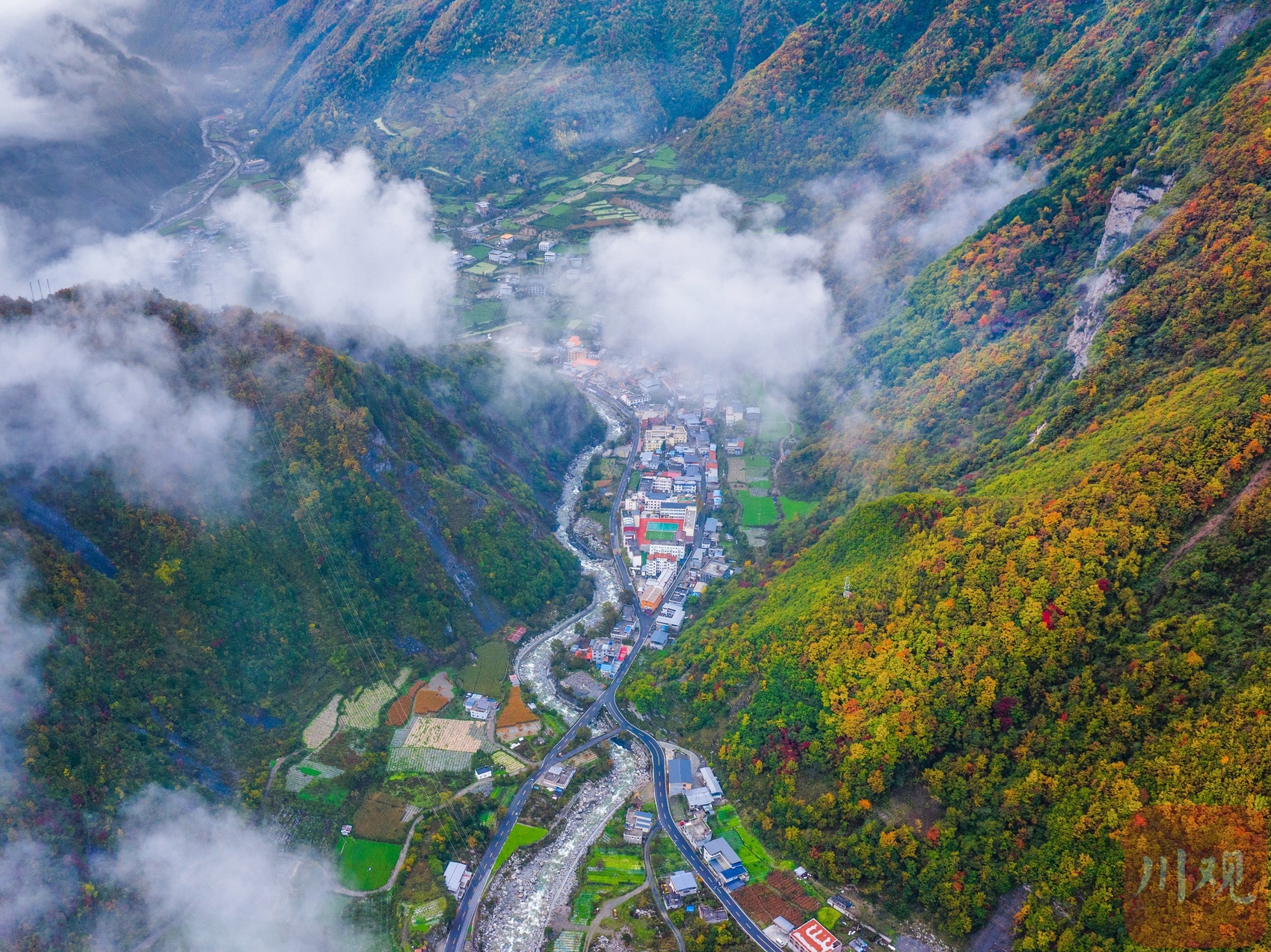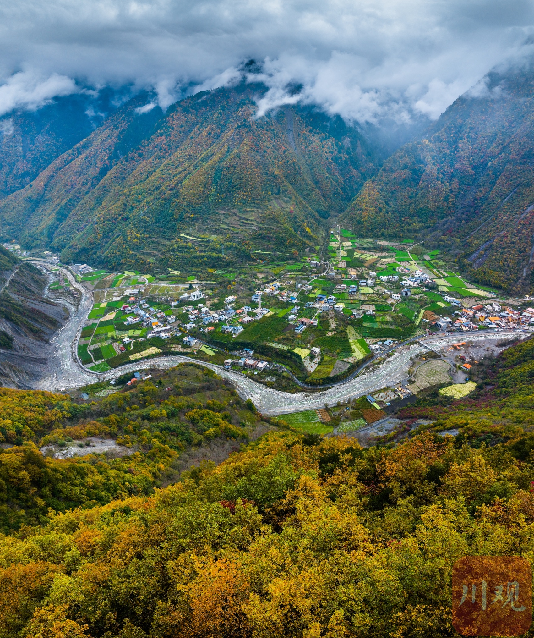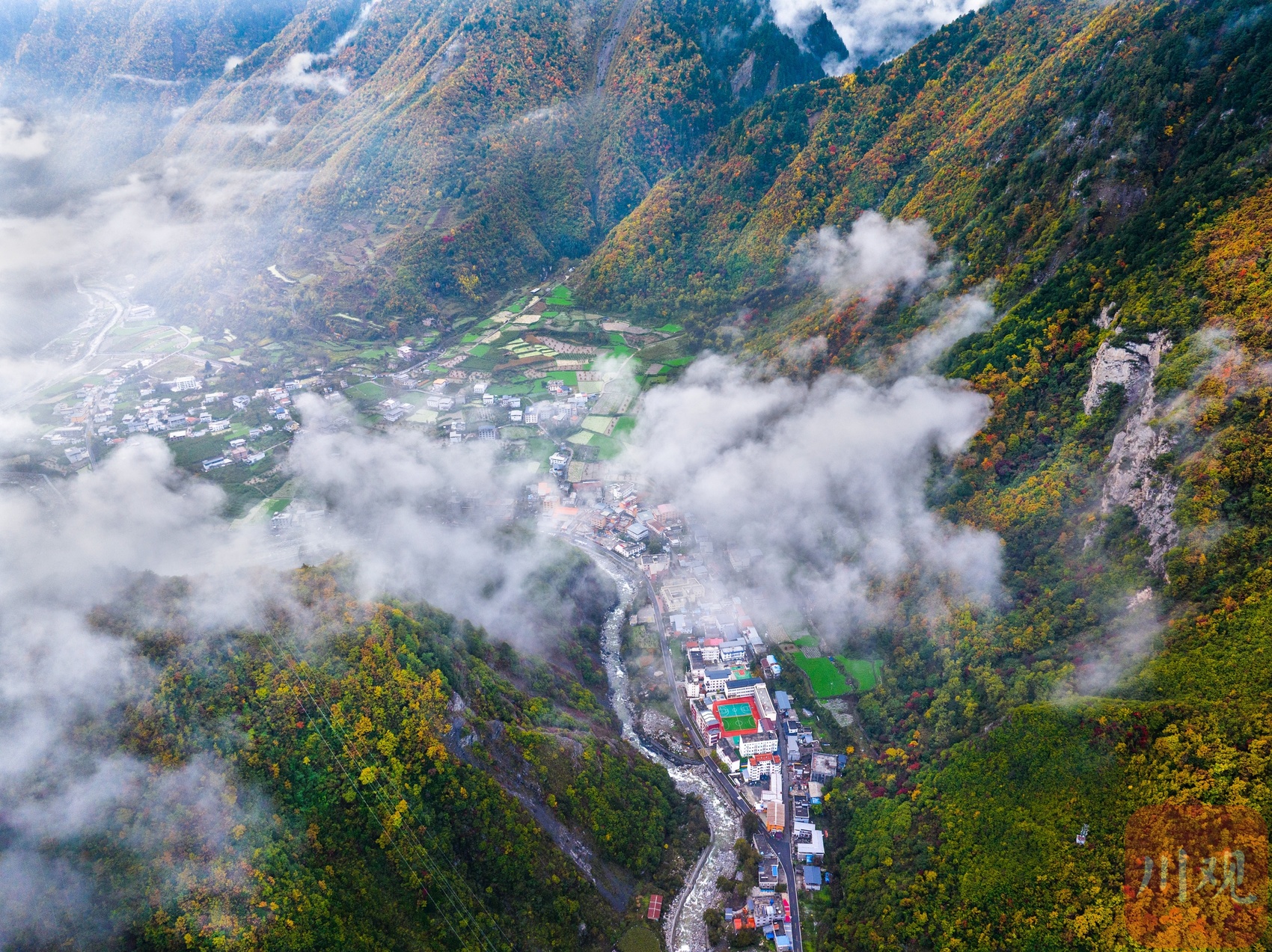十月下旬,阿坝州理县孟屯河谷在秋天的晨雾中醒来了。群山环绕,大片大片的高山草甸已经浓墨重彩,漫山林叶披上盛装。河谷内流水徐徐,谷中的民居村庄静静卧在群山的怀抱中,安详静谧,人与自然的和谐画卷仿若一幅大师的杰作!