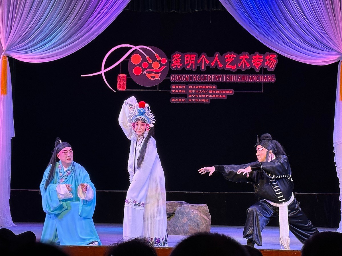 “今天我带来的三段表演,分别是闺门旦、花旦、青衣旦,力求在舞台呈现不同的角色类型。”演出结束后,遂宁市川剧团国家二级演员龚明表示,“我从上世纪80年代开始学习川剧表演,一直很热爱川剧艺术,今天的演出也算是我近40年的川剧生涯的阶段性总结。我希望继承发扬老一辈的传统,也能鼓励带动下一代年轻演员精进技艺。”