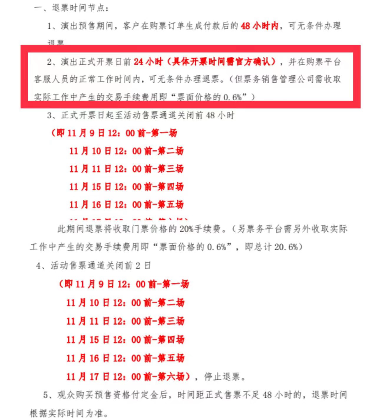 或许由于网友投诉太多,发稿前,记者查阅看到,演唱会主办方委托平台更改了退票窗口时间。陈奕迅成都演唱会新的购票须知显示:预售开启后24小时内可无条件退票,正式开票后24小时内退票收20%手续费,开票24小时后至首场演出开始前7日退票手续费为40%,其他时间不能退票。