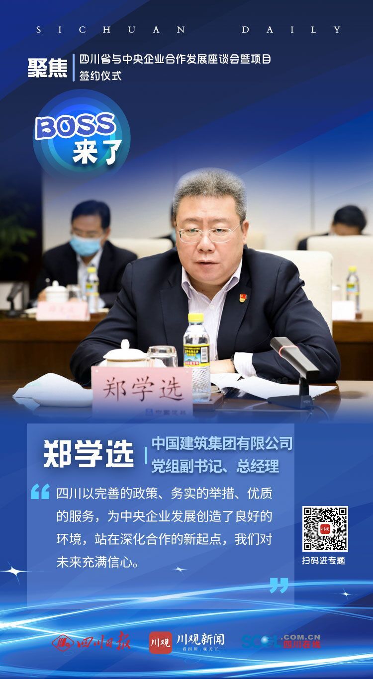 在郑学选看来,此次签约项目覆盖了绿色建造、装配式建筑、电子商务、高端装备制造等领域,对推动四川经济结构调整和产业转型升级具有积极意义。他表示,四川以完善的政策、务实的举措、优质的服务,为中央企业发展创造了良好的环境,站在深化合作的新起点,我们对未来充满信心。