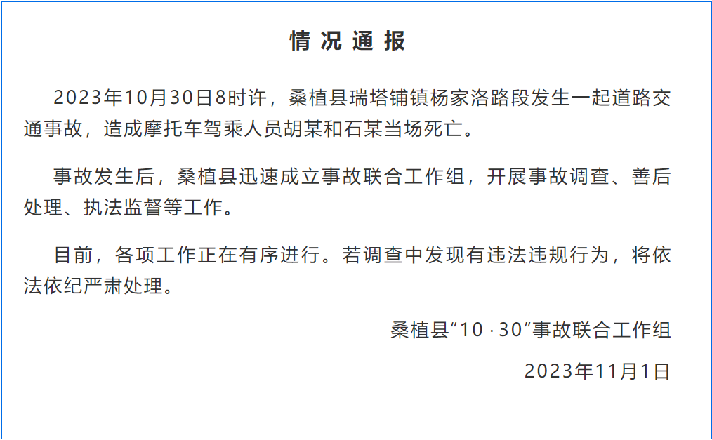 11月1日凌晨,桑植县“10·30”事故联合调查组发布情况通报,称此次事故造成摩托车驾乘人员胡某和石某当场死亡。