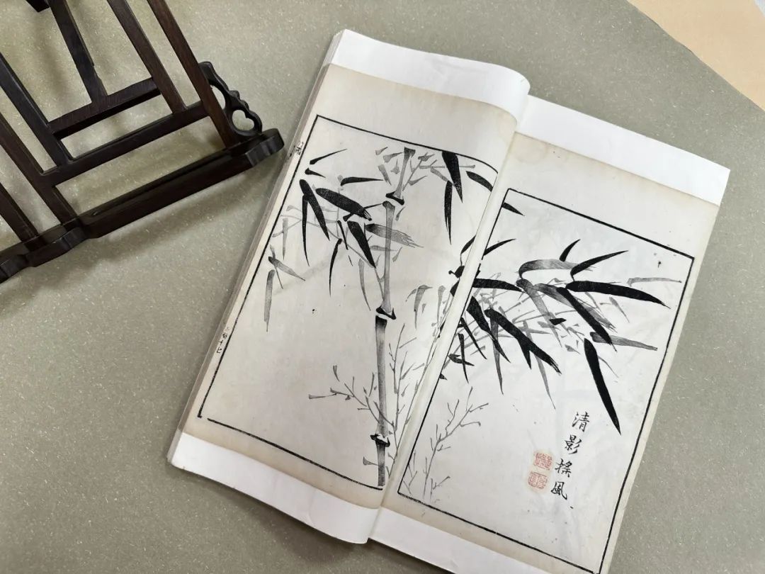 本次展览展出的《芥子园画传》刀法细腻,色彩绚丽,品相完好,书中钤有“啸谷精鉴”朱印,据此可知为杨啸谷先生旧藏。丁伟介绍,《芥子园画传》问世以来屡经翻刻,质量良莠不齐,四川大学藏本纸墨俱精,设色准确,较能如实反映原作的面貌,是不可多得的艺术精品。