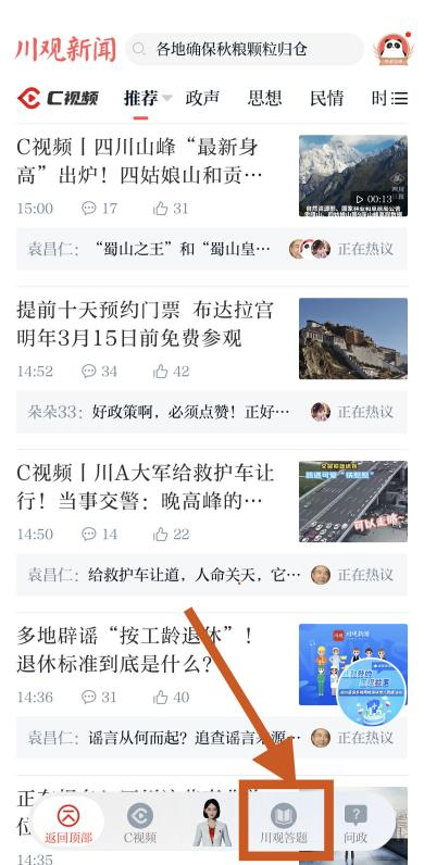 在川观新闻首页,点击“川观答题”,找到“川赢位来就业政策答题挑战赛”活动图片,点击参与。