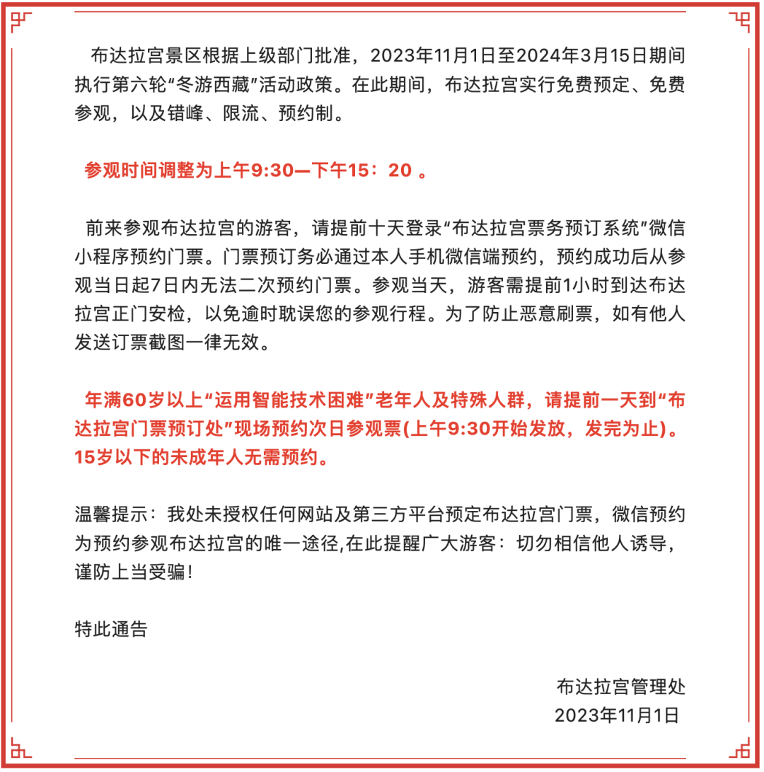 据“西藏发布”消息,11月1日,布达拉宫管理处发布《关于第六轮“冬游西藏”通告》。《通告》表示,布达拉宫景区根据上级部门批准,2023年11月1日至2024年3月15日期间执行第六轮“冬游西藏”活动政策。在此期间,布达拉宫实行免费预定、免费参观,以及错峰、限流、预约制。参观时间调整为上午9:30—下午15:20。