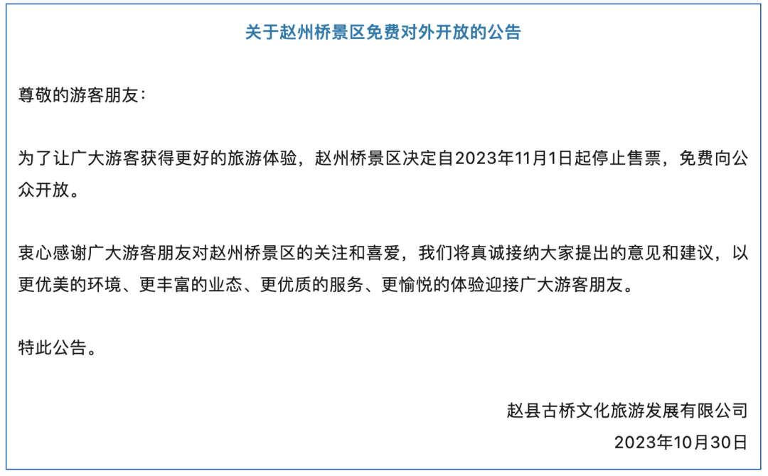 石家庄赵县赵州桥景区决定自2023年11月1日起停止售票,免费向公众开放。