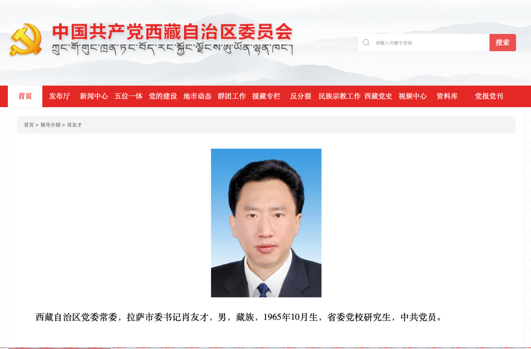 另据西藏自治区党委官网“领导介绍”栏目显示,肖友才现任西藏自治区党委常委、拉萨市委书记。此前,他为西藏自治区党委常委,自治区人民政府常务副主席、党组副书记。