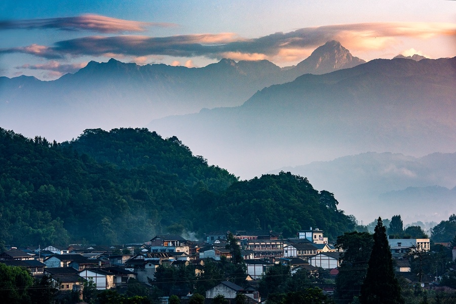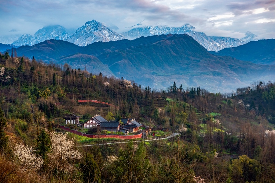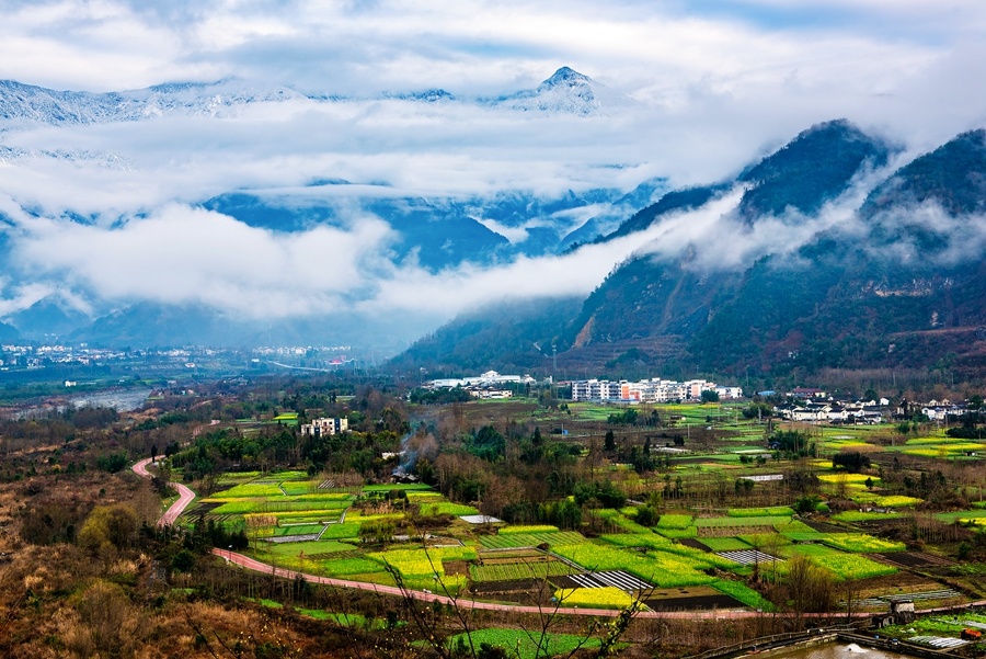 彭州,一座雪山下的立体山水公园城市,它拥有无与伦比的天际线。北拥龙门山之巍峨,南抱成都平原之广袤,龙门入云天、孕九峰,湔江出龙门、分九水。 作为成都北部生态屏障、4300米的海拔落差造就了山、丘、坝俱全的地形地貌,一半群山叠嶂,另一半沃野铺陈,恰似微缩版的四川,山川河谷、富庶平原和林盘清泉,共同构成一幅天然的立体山水画卷。
