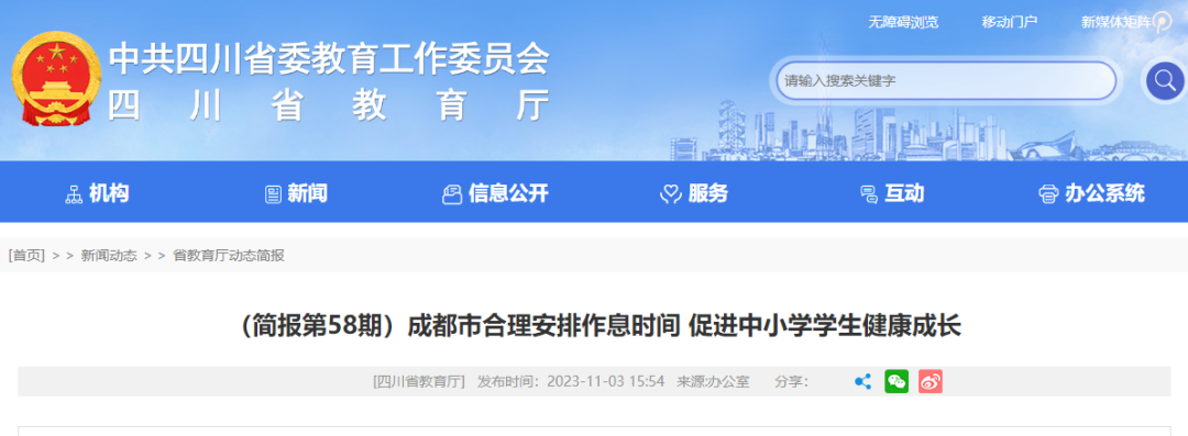 11月3日,教育厅以简报的形式转发了成都市做法,要求各地各校要结合实际,认真学习借鉴,坚持以生为本,遵循教育规律,严控作业总量,注重家校共育,保证休息时间,切实推动“双减”政策落地落实,努力以教育良好生态促进学生全面发展、健康成长,进一步提升人民群众教育满意度。