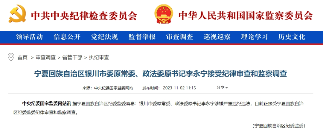 11月2日,据宁夏回族自治区纪委监委消息,银川市委原常委、政法委原书记李永宁涉嫌严重违纪违法,目前正接受宁夏回族自治区纪委监委纪律审查和监察调查。