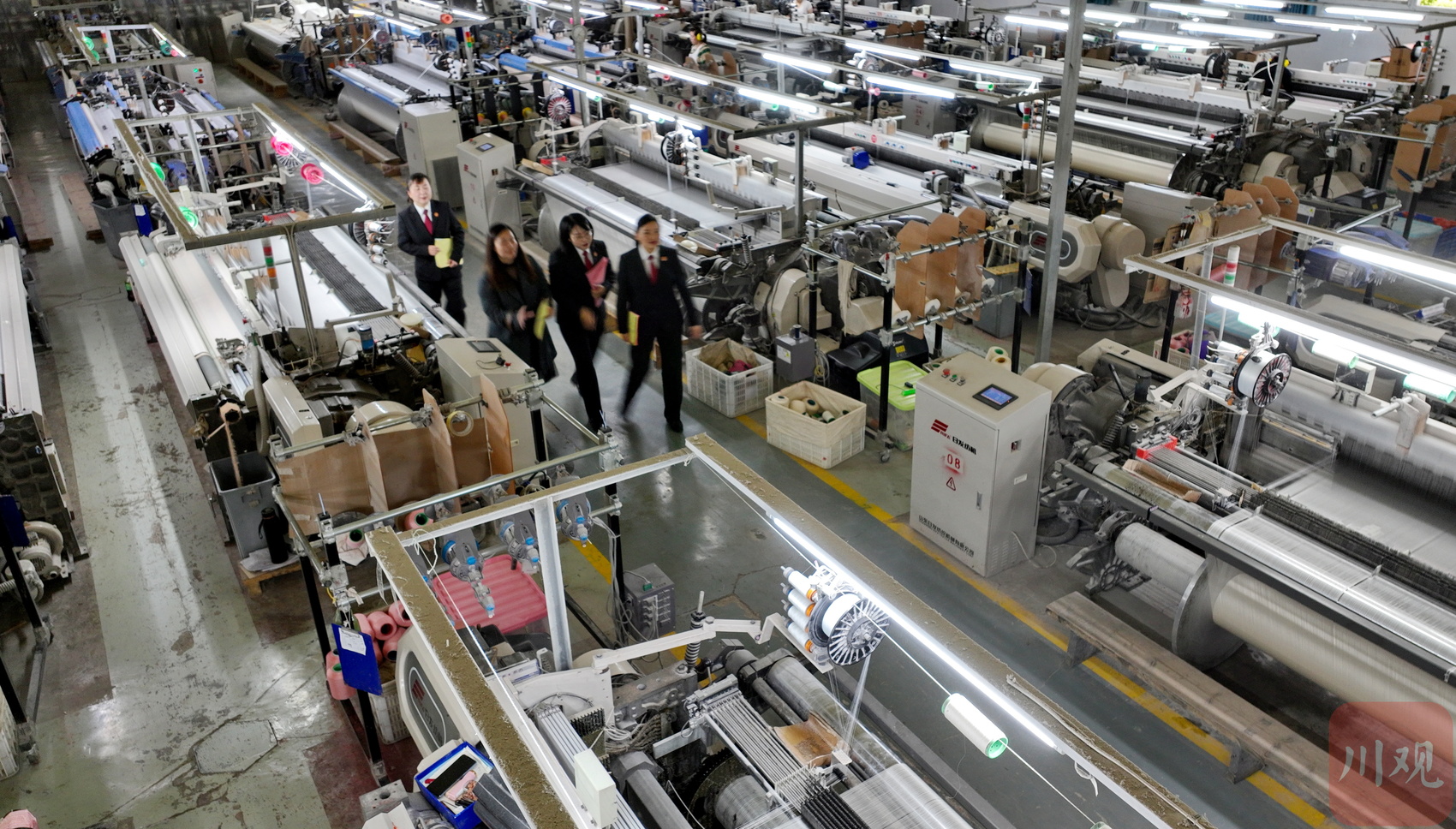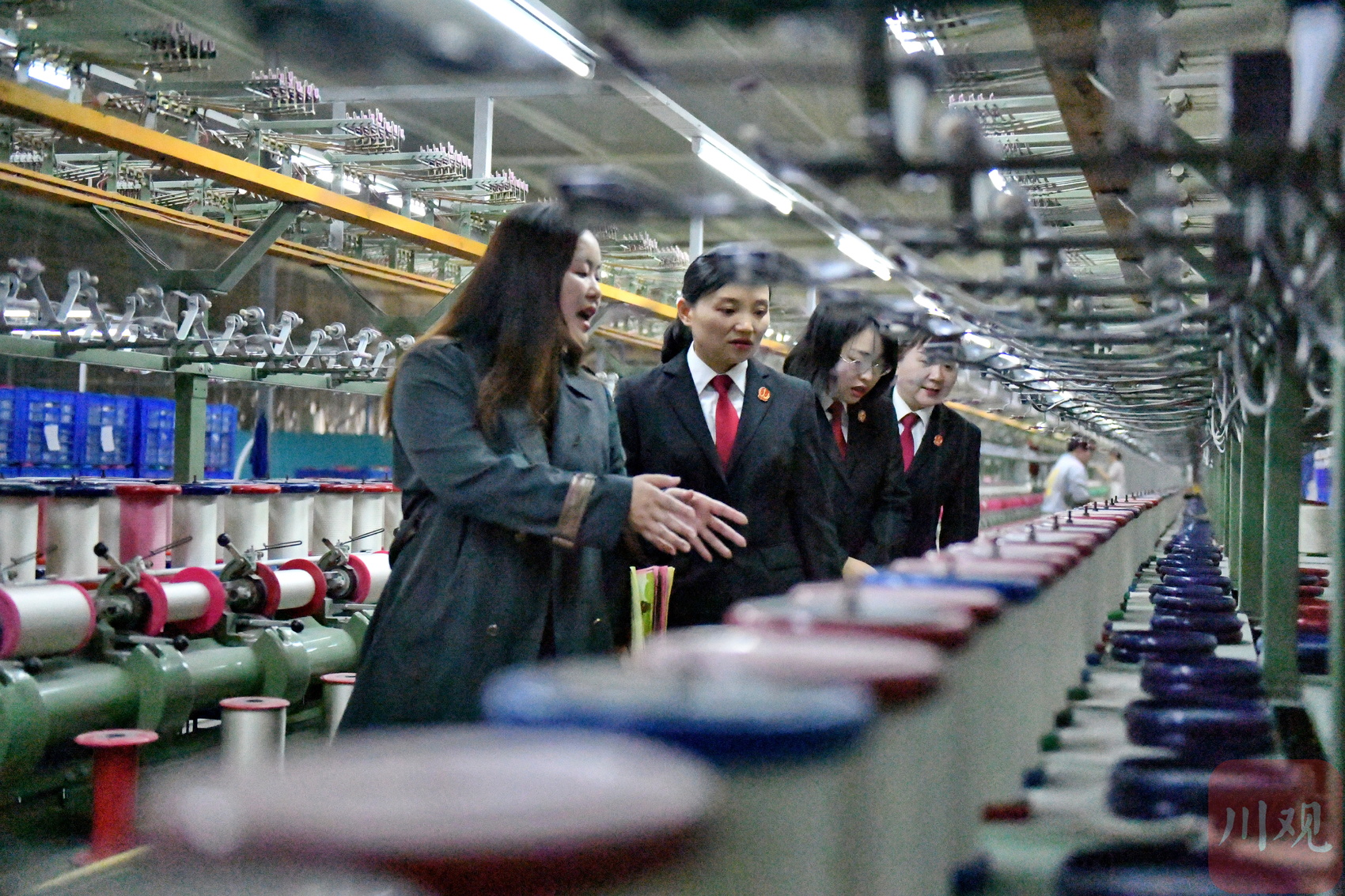2023年11月3日,在四川顺成纺织品有限公司生产车间,南充市嘉陵区人民法院的法官了解企业安全生产和经营状况以及存在的困难和问题,并进行普法宣传。