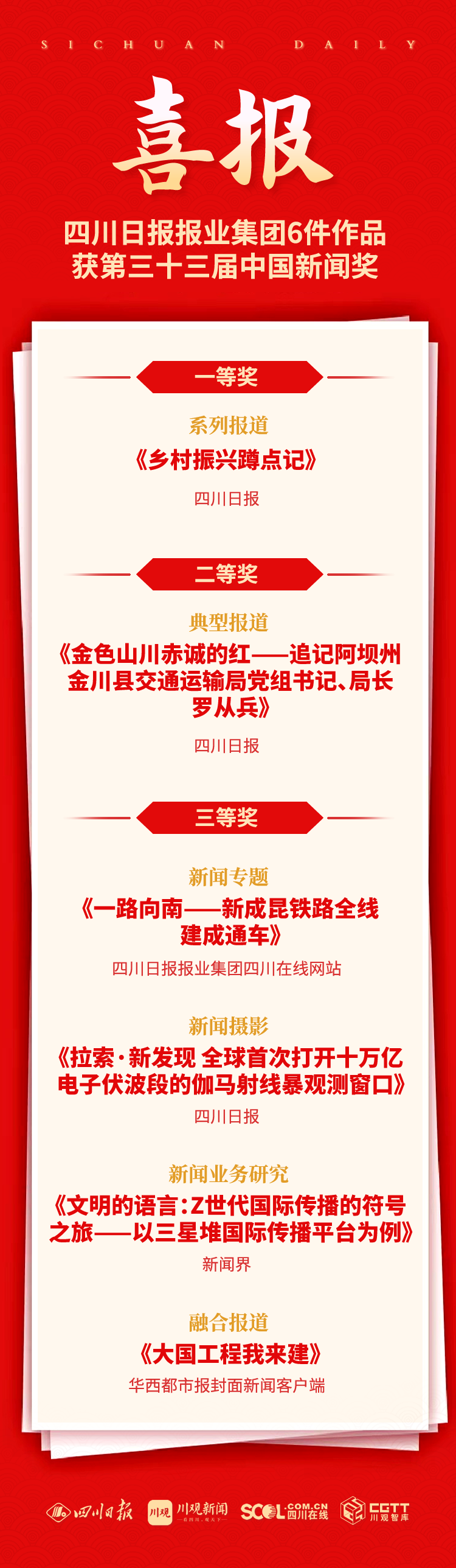 刚刚,第33届中国新闻奖评选结果揭晓,来自全国各级各类媒体的377件作品获中国新闻奖。其中,四川日报报业集团共6件作品上榜(一等奖1件、二等奖1件、三等奖4件)。