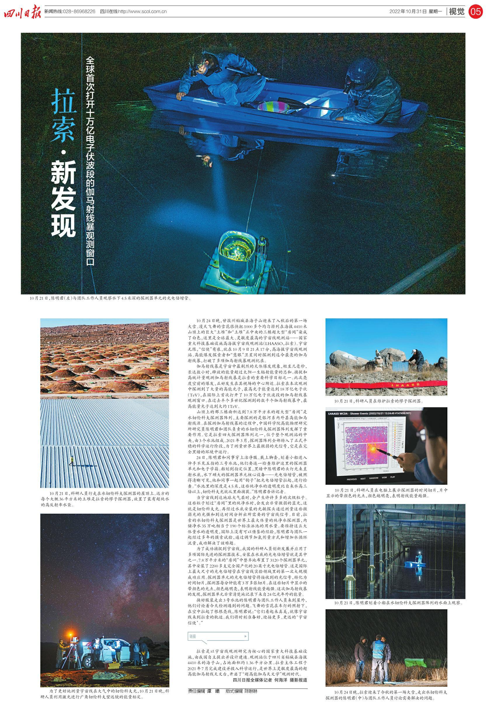 《拉索·新发现 全球首次打开十万亿电子伏波段的伽马射线暴观测窗口》记录了国家重大科技基础设施高海拔宇宙线观测站(LHAASO,拉索) 探测到迄今最亮的伽马射线暴,并打破多项伽马射线暴观测纪录的重大科技新闻。摄影记者用浩瀚的星辰、漫天的飞雪为影像记录营造出令人充满想象的现场氛围,用镜头记录下科学工作者的工作场景,向读者展示了拉索不为人知的一面。