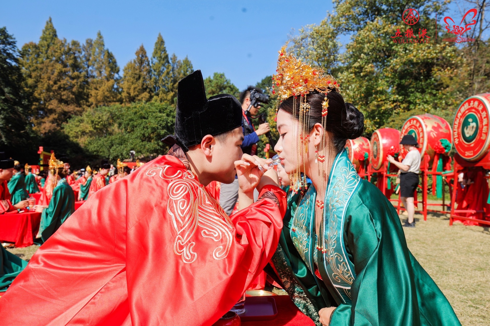 “宋韵文化”作为婚典的主旋律,贯穿幸福启程、西湖迎亲、红毯风采、彩船畅游、花车巡游、醉美喜宴、西湖盛典七大篇章。新人们穿着宋制婚服,携手走过太子湾公园、苏堤、白堤、断桥、柳浪闻莺以及印象西湖,行却扇礼、沃盥礼、饮合卺酒、执手盟誓缔结白首之约——传统仪式的背后,是穿越古今的宋韵文化为本次婚典赋予的独有文化底蕴。