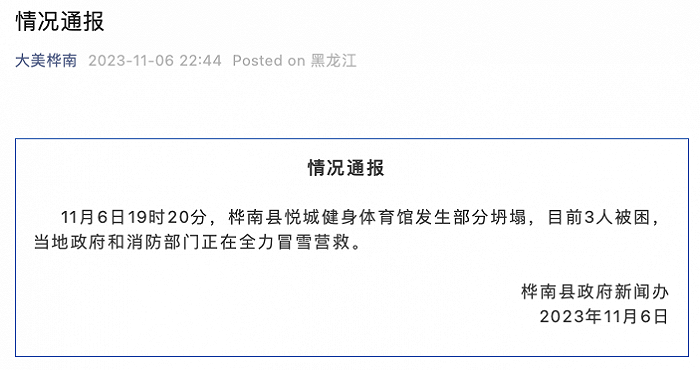 11月6日晚间,桦南县政府新闻办发布情况通报:11月6日19时20分,桦南县悦城健身体育馆发生部分坍塌,目前3人被困,当地政府和消防部门正在全力冒雪营救。