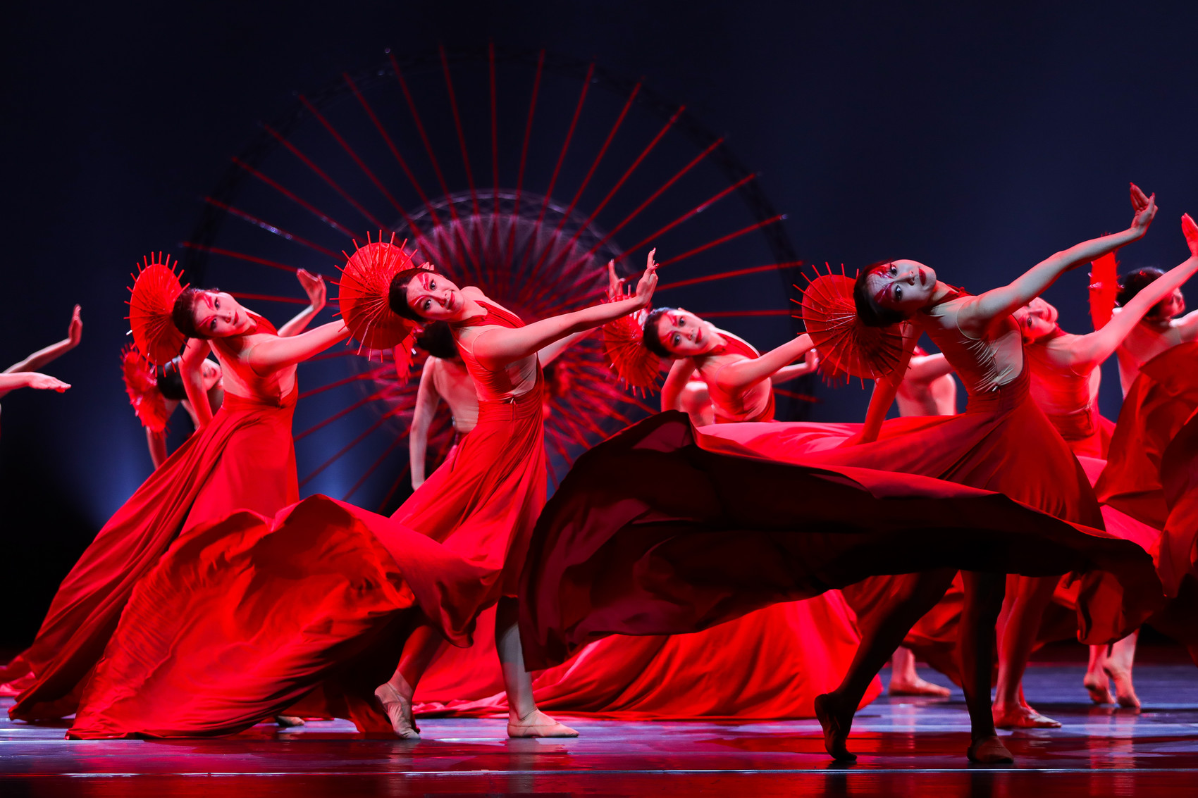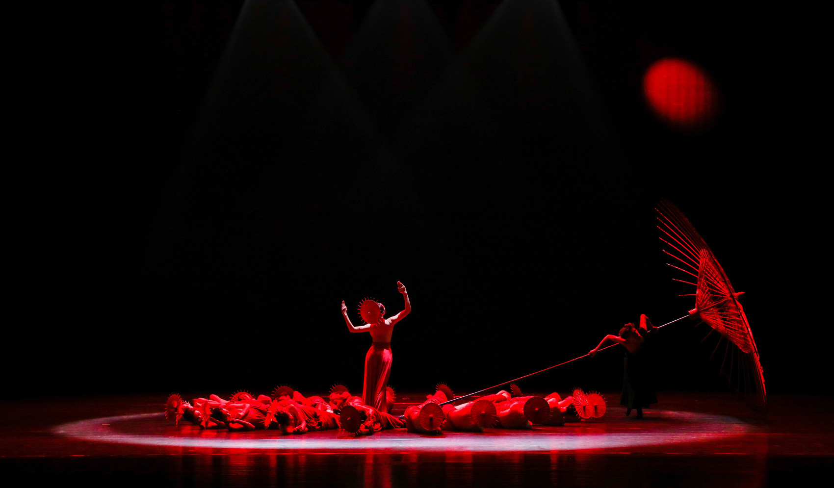 杨畅与服装设计师崔晓东商量,给舞者头戴红色伞饰,远远望去像是红色伞面。“如果让她们打伞跳舞,又容易跳入传统表达方式,做成头饰更加抽象,也可以让她们的动作表达更加自由。”杨畅说。