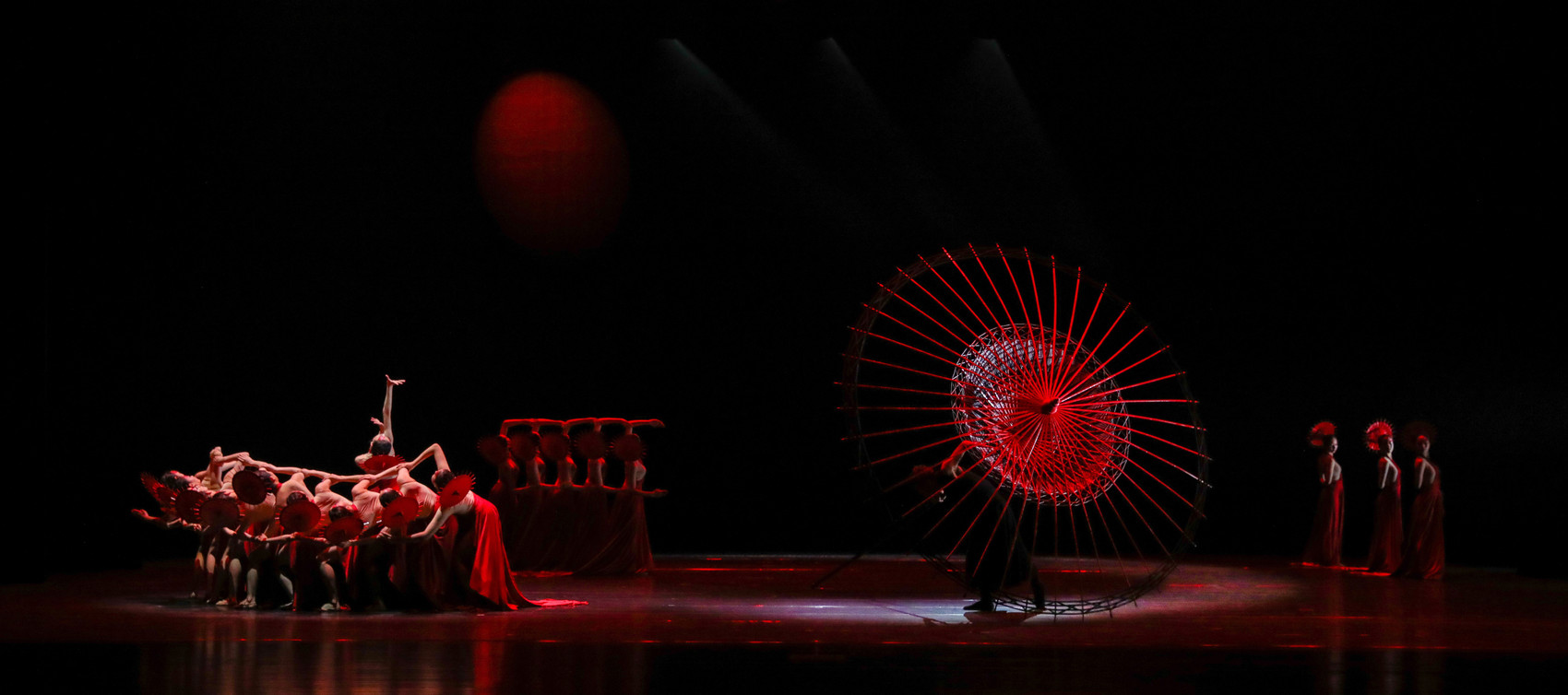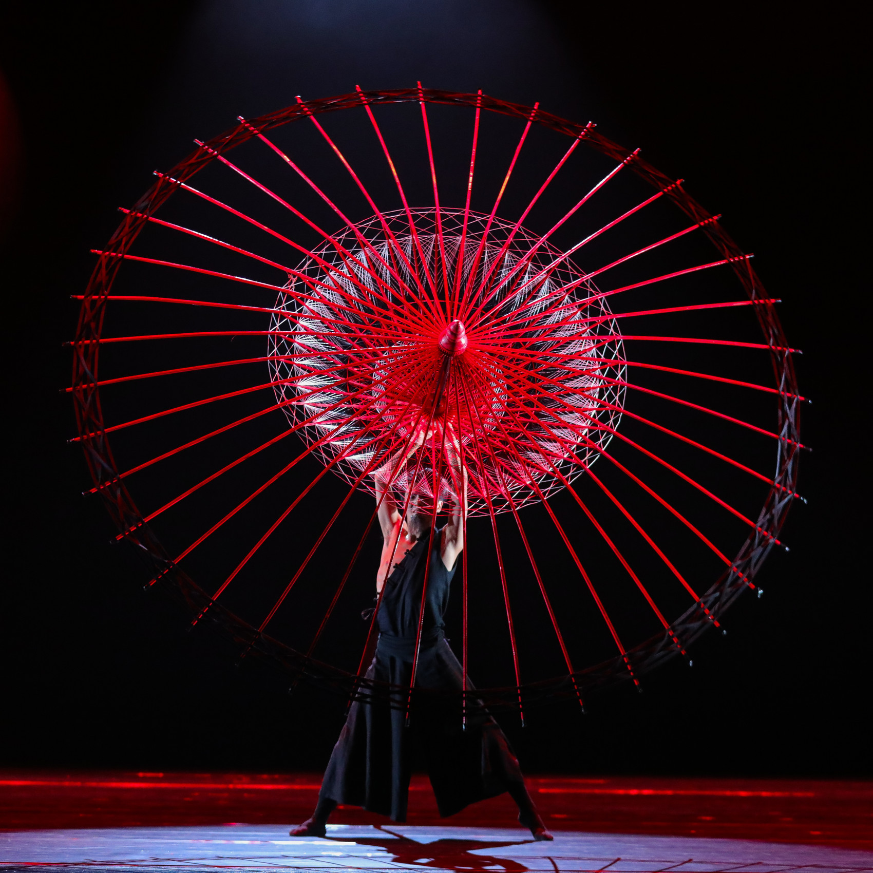 舞台上,一面巨大的伞骨,在一位“老翁”的推动下,如同时间轴,在持续的推动中流转,这是非遗传承人在代代相传做伞的意象化表达。伞推到前面,透过镂空的伞骨,观众可以看到后面的舞者,充满了空间感和时间感。